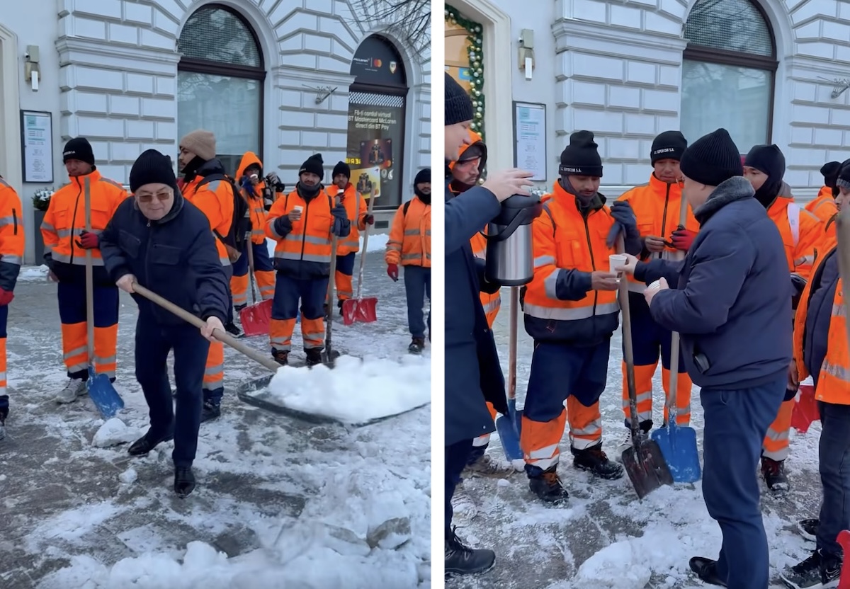 După ce i-a servit cu ceai, edilul a pus și el mâna pe lopată pentru a curăța trotuarul.
