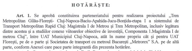 Consiliul Local a aprobat, marți, un proiect de parteneriat între municipiul Cluj-Napoca și societatea de transport cu metroul Bucureşti „Metrorex" S.A. pentru realizarea metroului din Cluj.