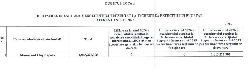 Spre exemplu, pentru anul 2025, excedentul bugetar înregistrat de municipalitatea clujeană este de 1.013.221.305 lei – fonduri ce vor fi utilizate în 2026 pentru finanțarea secțiunii de dezvoltare.