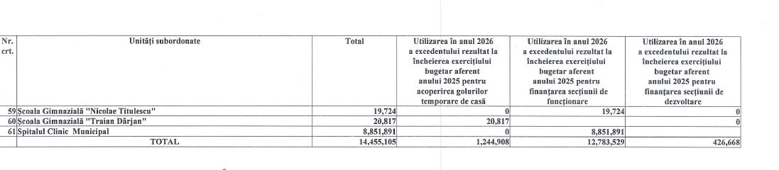 În cazul excedentului aferent bugetului instituțiilor publice şi activităților finanțate integral sau parțial din venituri proprii, rezultat la încheierea exercițiului bugetar aferent anului 2025, fondurile în valoare de 14.455.105 lei - vor fi utilizate pentru finanțarea a 60 de unități de învățământ preuniversitar, precum și a Spitalului Municipal Clujana.