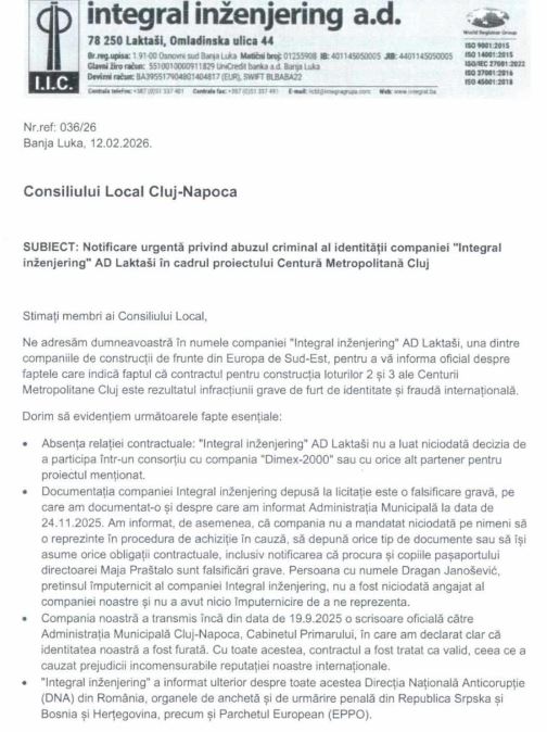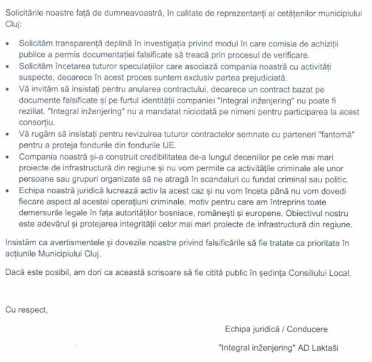 „Insistăm ca avertismentele și dovezile noastre privind falsificările să fie tratate cu prioritate în acțiunile Municipiului Cluj-Napoca. Dacă este posibil, am dori ca această scrisoare să fie citită public în ședința Consiliului Local”, menționează Integral Inženjering AD Laktasi în adresa menționată.