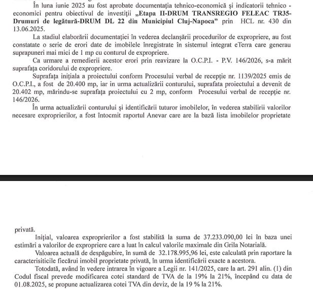 Acum, aleșii locali vor dezbate spre aprobare actualizarea cotei de TVA de la 19% la 21%. De asemenea, în urma actualizării datelor de cadastru de către instituția de profil, precum și a valorilor aprobate pentru expropriere, sumele alocate inițial pentru despăgubiri vor fi diminuate.