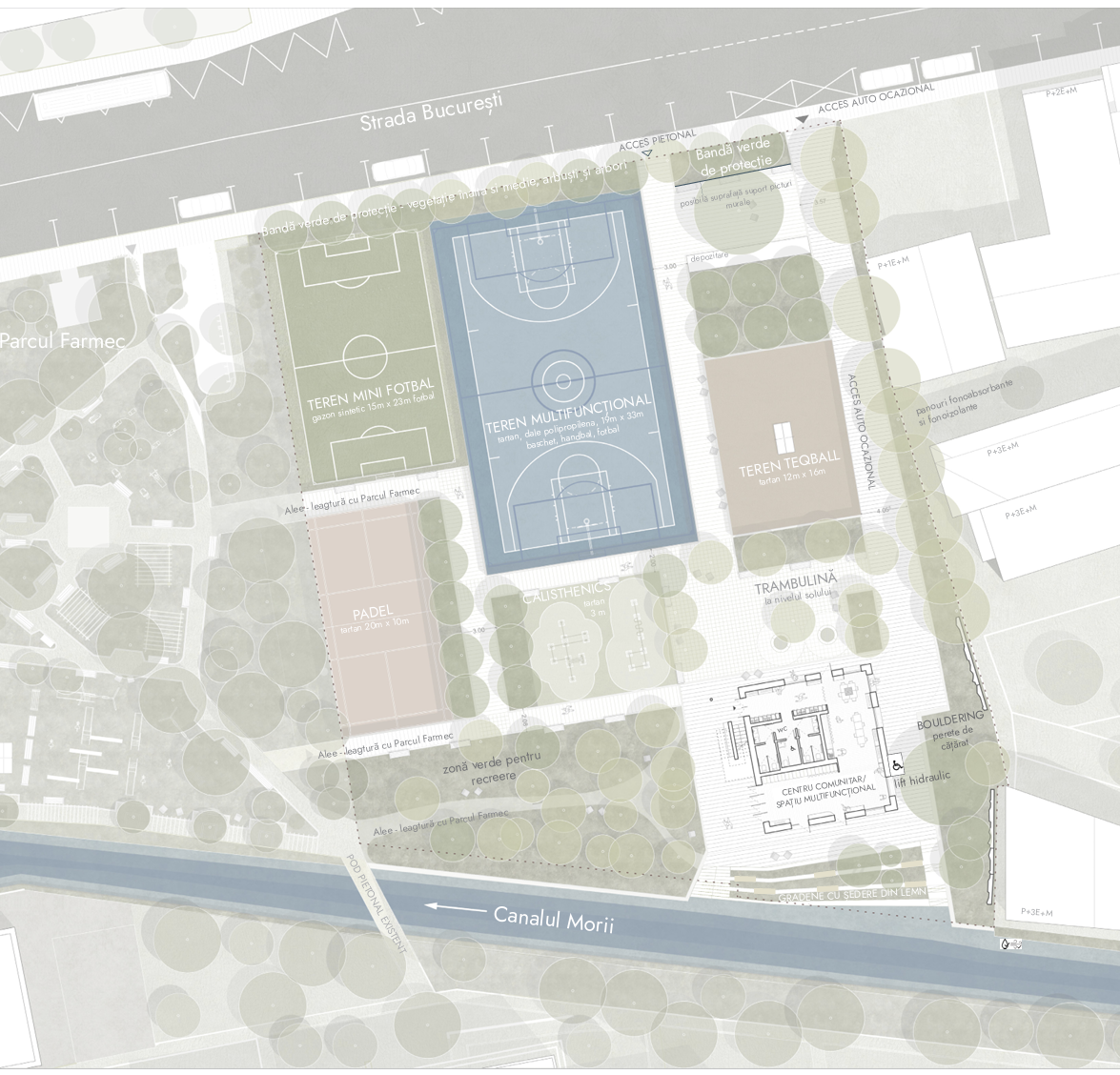 Proiectul continuă transformarea parcului Farmec. Extinde zona verde și reactivează baza sportivă într-un spațiu deschis, conectat și multifuncțional. Conceptul ales pune accent pe accesibilitate, integrare urbană și sustenabilitate și include un centru comunitar dedicat activităților diverse.