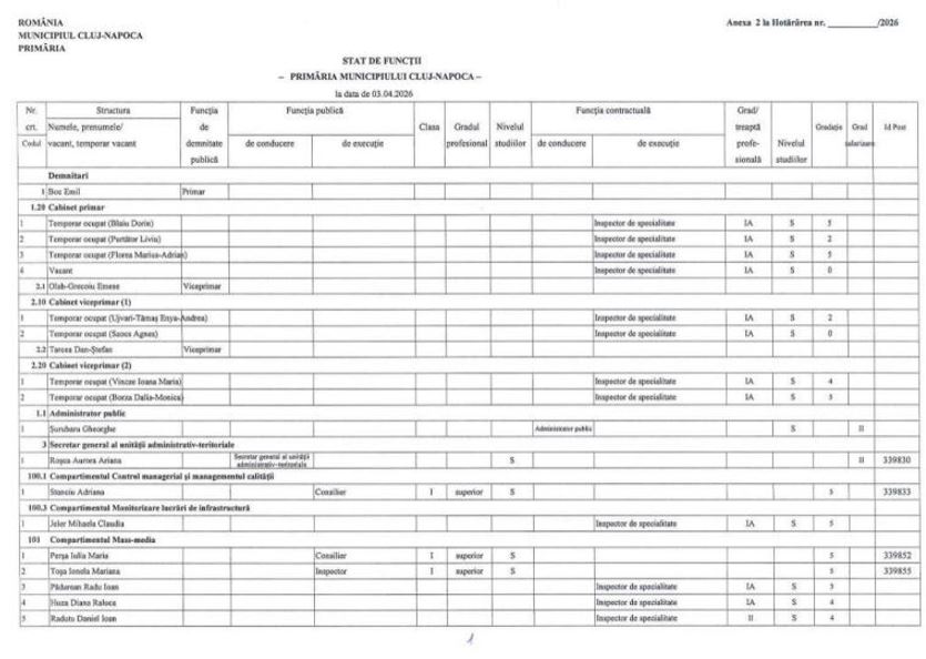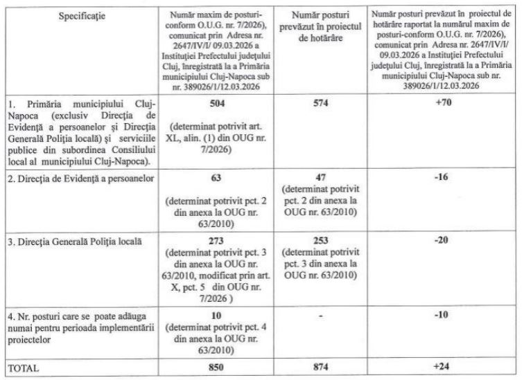 „Având în vedere prevederile art. XL, alin. (7), lit. c) şi alin. (11) din O.U.G. nr. 7/24.02.2026 pentru modificarea şi completarea unor acte normative, precum şi pentru adoptarea unor măsuri pentru creşterea capacității financiare a unităților administrativ-teritoriale, în mod temporar, cu implementarea de la 1 iulie 2026, ca variantă alternativă la reducerea de posturi prevăzute în Statul de funcții şi Organigrama ale Primăriei municipiului Cluj-Napoca (Anexele 1 şi 2 la prezenta hotărâre) peste numărul maxim de posturi (850 posturi), stabilit conform O.U.G. nr. 63/2010, cu modificările şi completările ulterioare, se va proceda la diminuarea cheltuielilor de personal, urmând ca începând cu 1 ianuarie 2027, numărul maxim de posturi prevăzute în structura organizatorică a Primăriei municipiului Cluj-Napoca să fie maxim 850 posturi”, se arată în proiectul de hotărâre ce va fi supus miercuri aprobării în Consiliul Local.