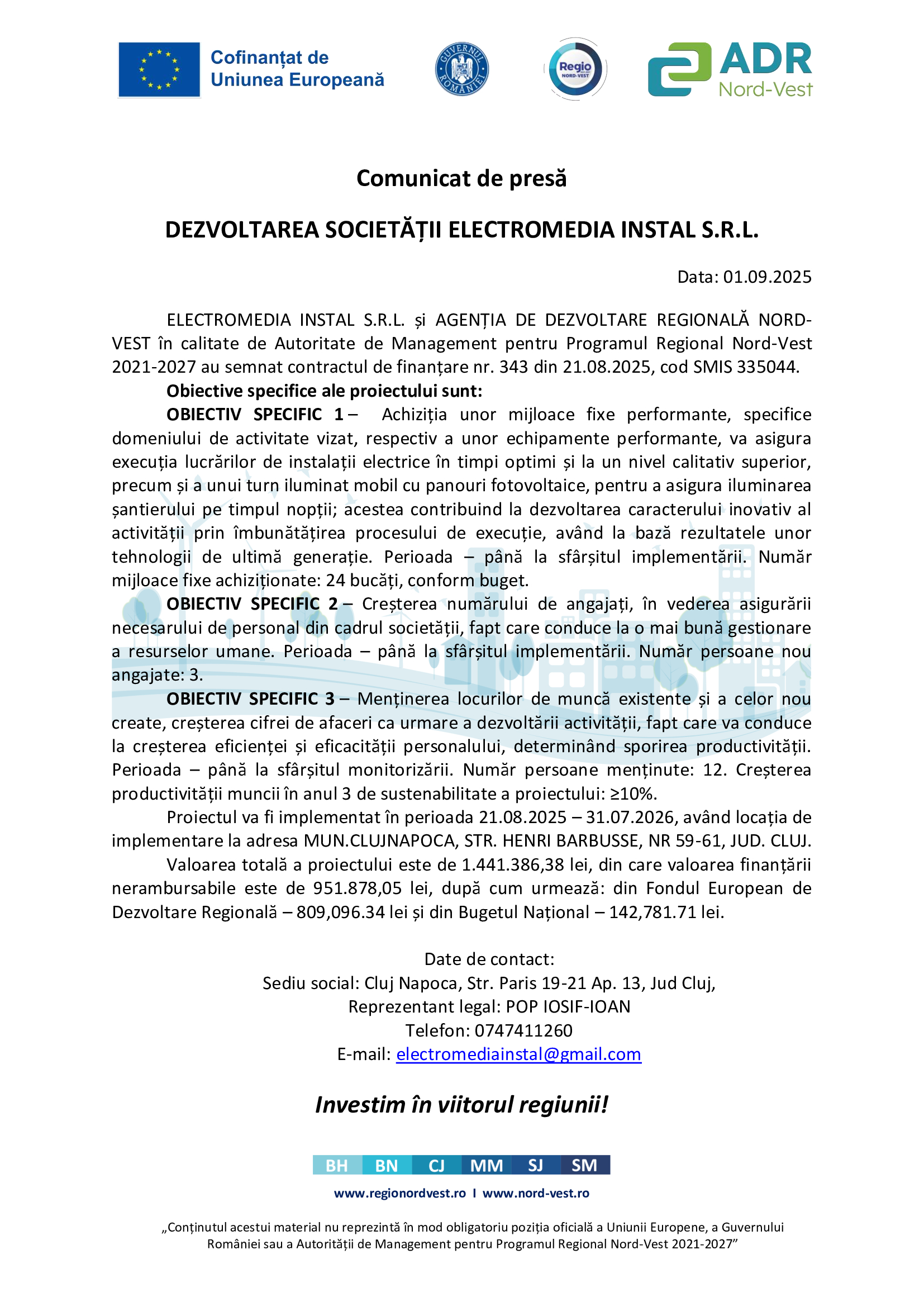Anunțuri Comunicat de presă - DEZVOLTAREA SOCIETĂȚII ELECTROMEDIA INSTAL S.R.L. Luni, 1 Septembrie 2025, Scris de: mica publicitate