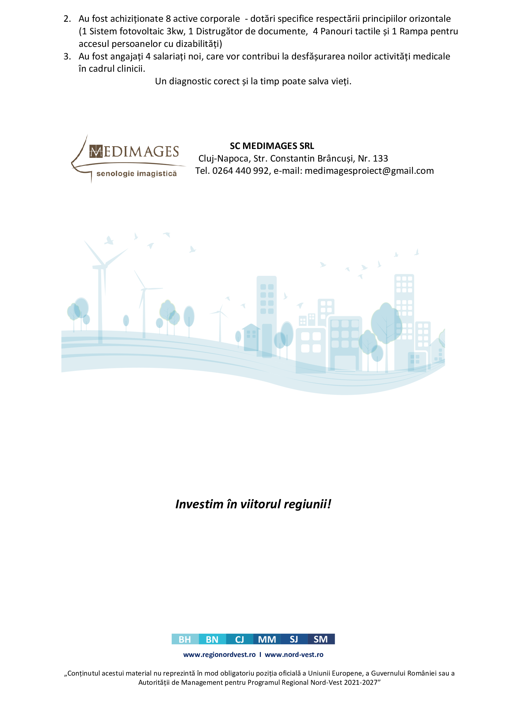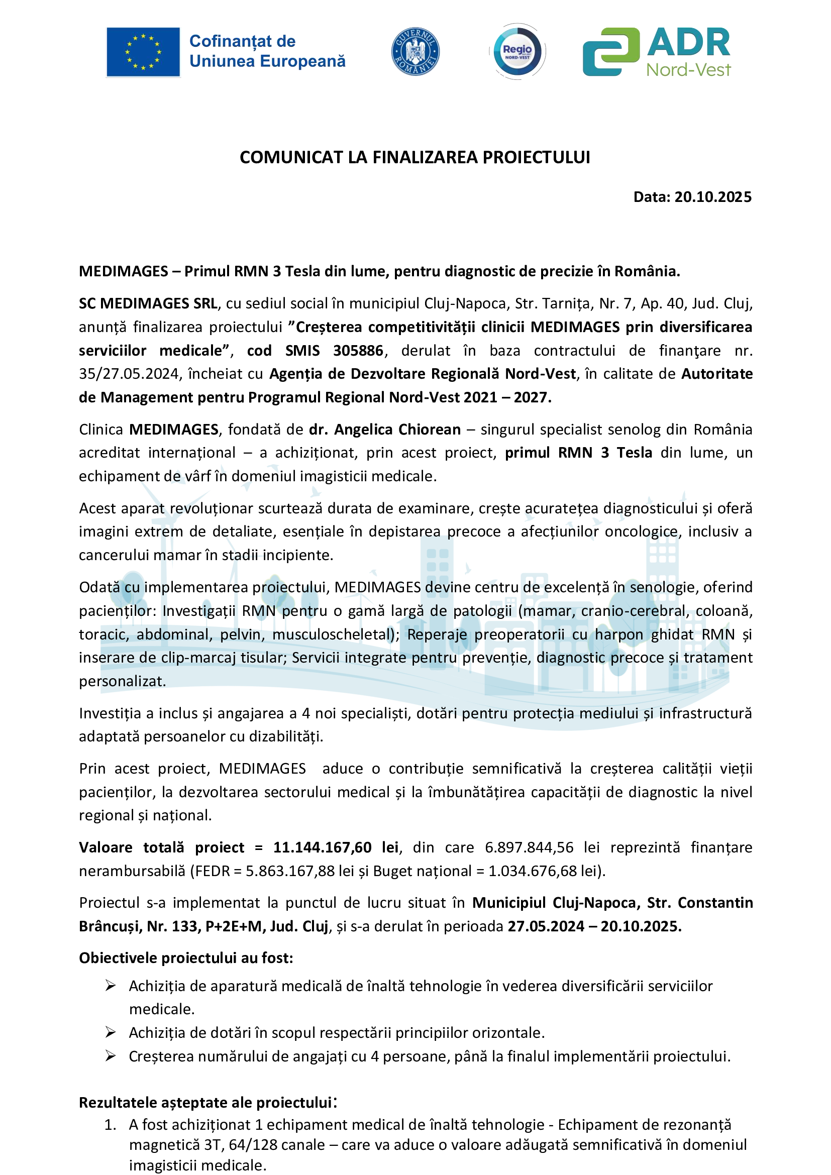 Anunțuri Comunicat la finalizarea proiectului ”Creșterea competitivității clinicii MEDIMAGES prin diversificarea serviciilor medicale”, cod SMIS 305886 15:17, Scris de: mica publicitate