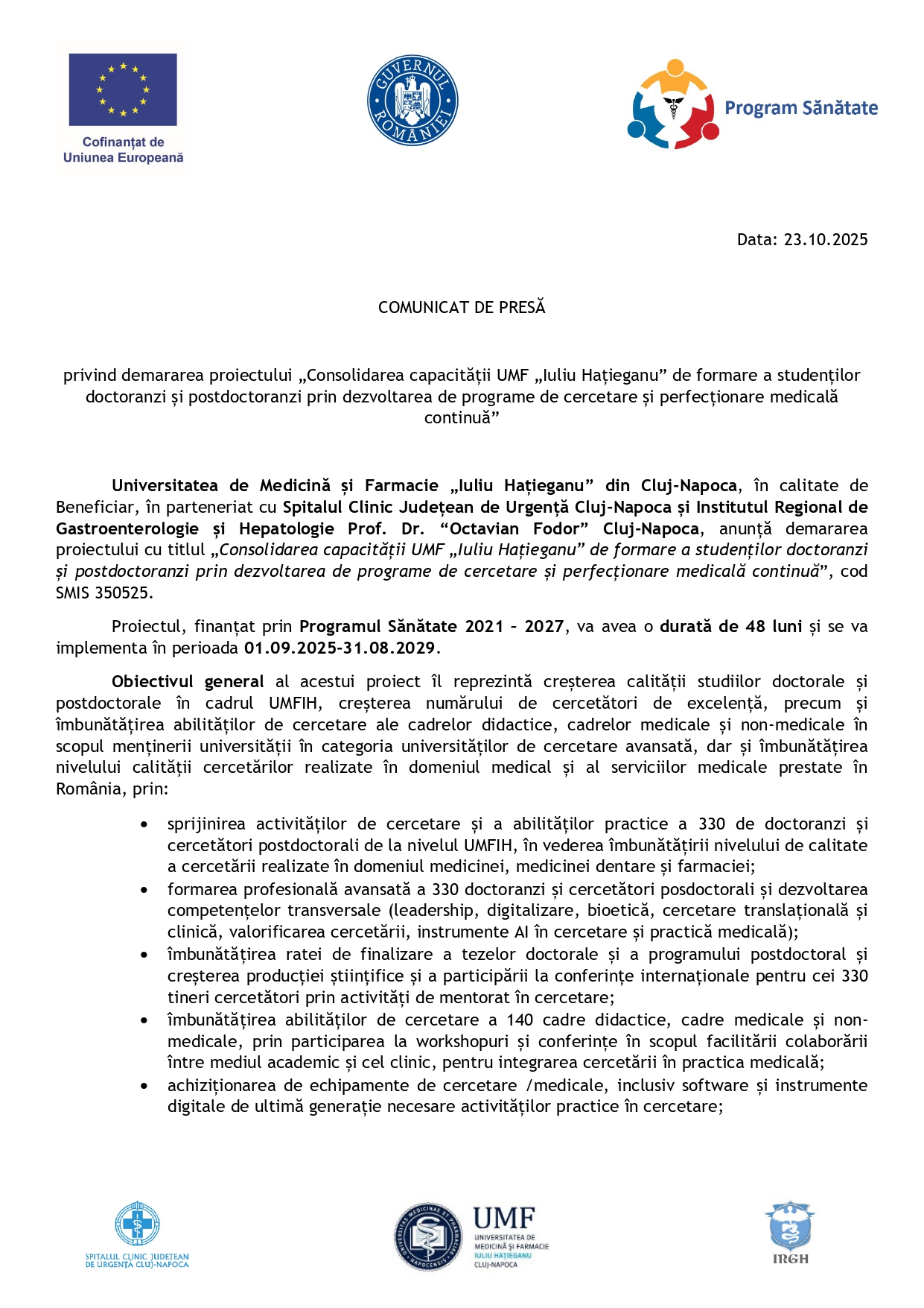 Anunțuri COMUNICAT DE PRESĂ - Universitatea de Medicină și Farmacie „Iuliu Hațieganu” din Cluj-Napoca 08:58, Scris de: Advertorial