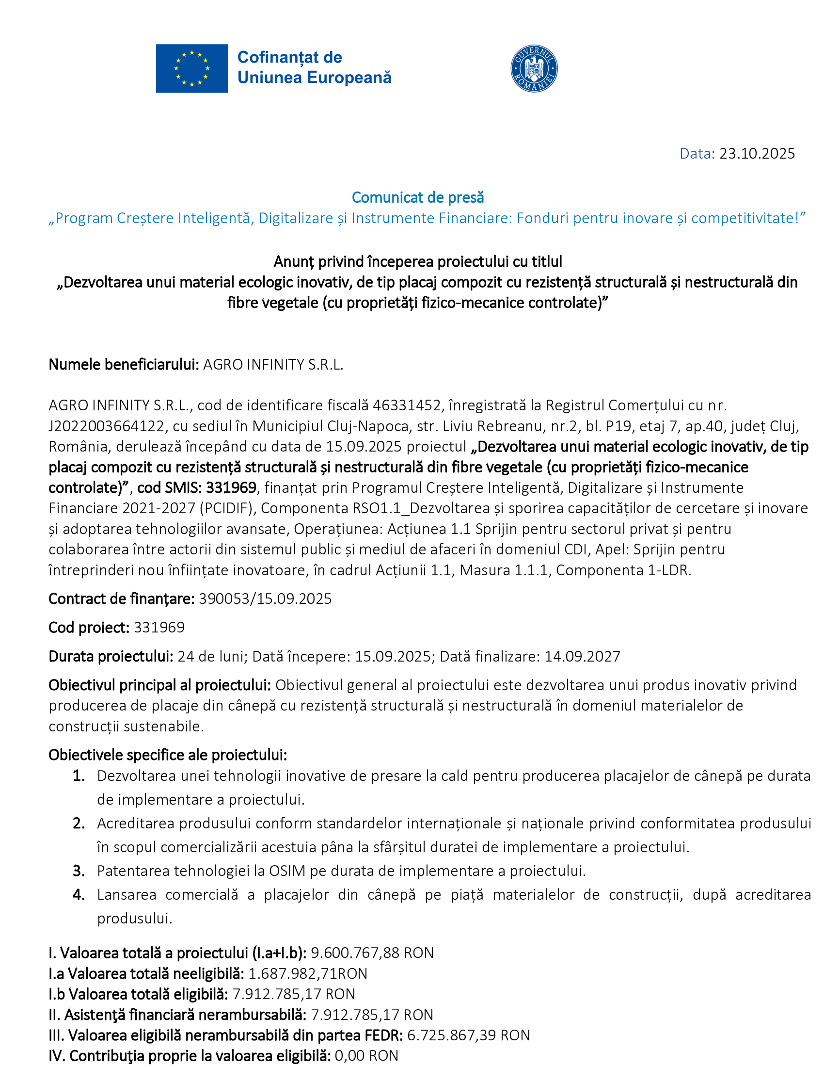Comunicat de presă - Anunț privind începerea proiectului cu titlul „Dezvoltarea unui material ecologic inovativ, de tip placaj compozit cu rezistență structurală și nestructurală din fibre vegetale (cu proprietăți fizico-mecanice controlate)”