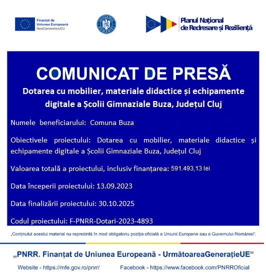 Anunțuri Comunicat de presă - Comuna Buza anunță finalizarea proiectului 11:42, Scris de: Advertorial Etichete: comunicat de presa comuna Buza