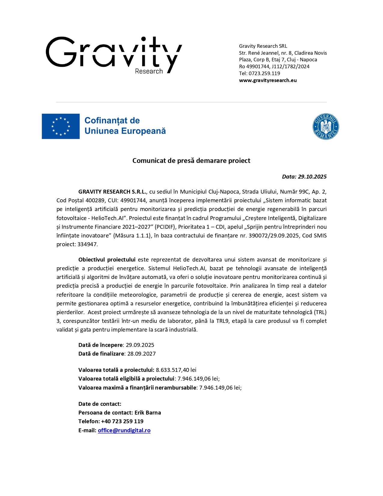 Anunțuri Comunicat de presă - Începerea implementării proiectului „Sistem informatic bazat pe inteligență artificială pentru monitorizarea și predicția producției de energie regenerabilă în parcuri fotovoltaice - HelioTech.Al.” Miercuri, 29 Octombrie 2025, Scris de: mica publicitate