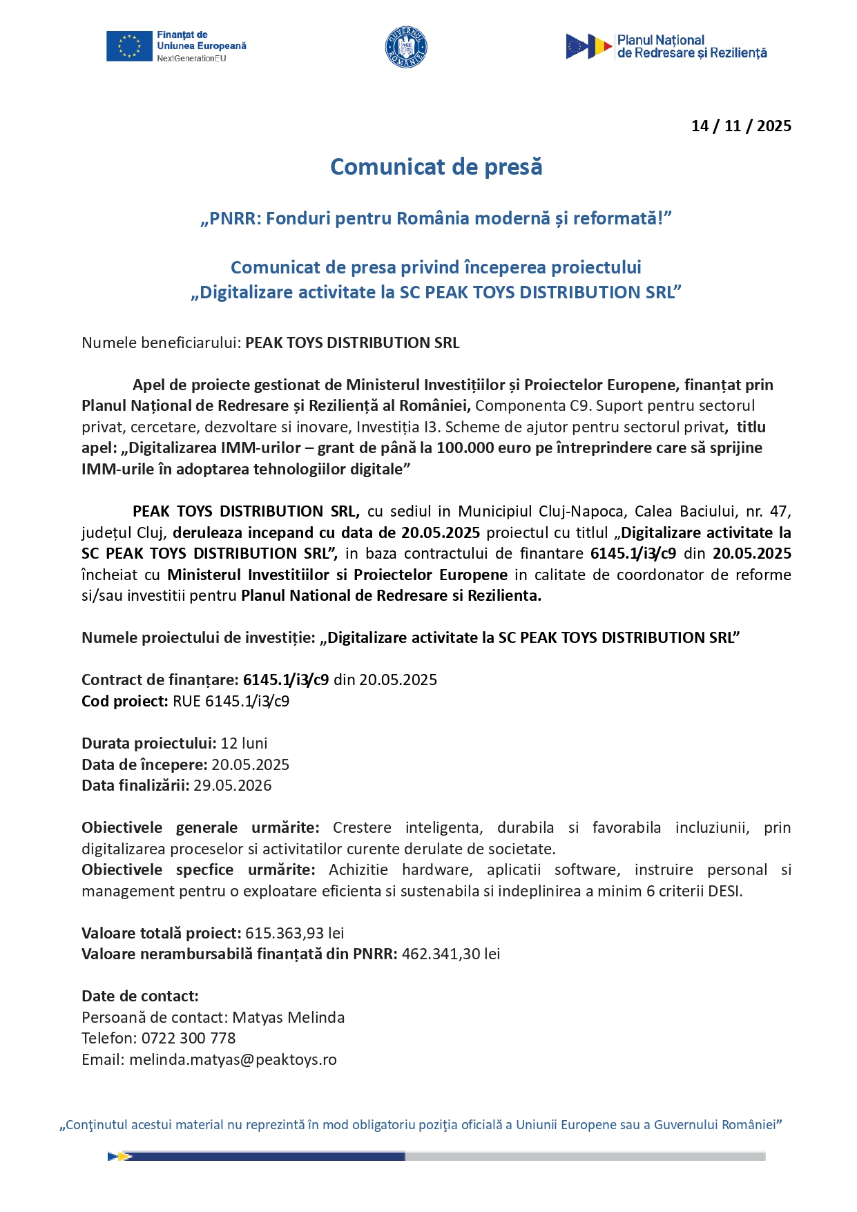 Anunțuri Comunicat de presă privind începerea proiectului „Digitalizare activitate la SC PEAK TOYS DISTRIBUTION SRL” 14:02, Scris de: Advertorial