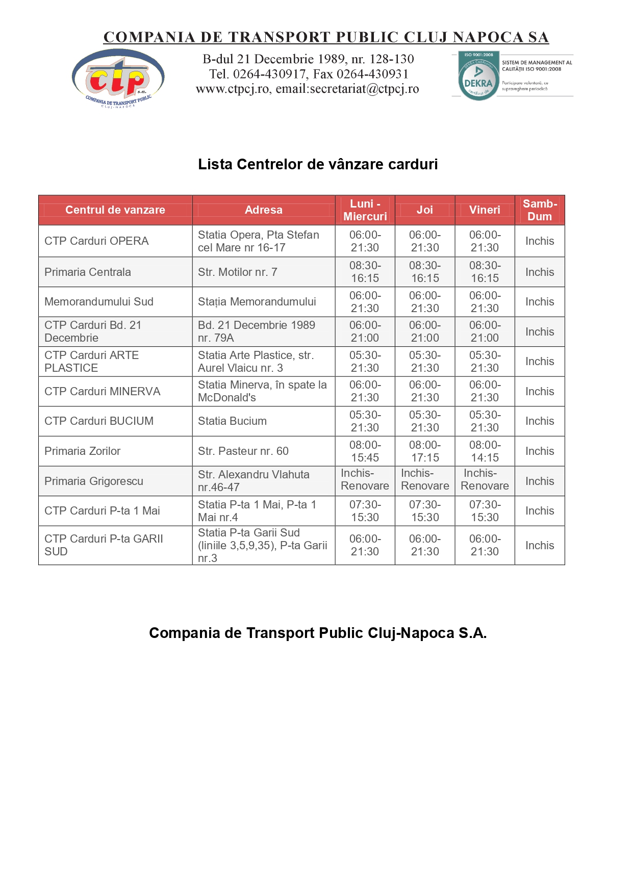 Punem la dispoziţie 10 Centre de vânzare și reȋncărcare carduri cu orar prelungit și 62 de Automate stradale.