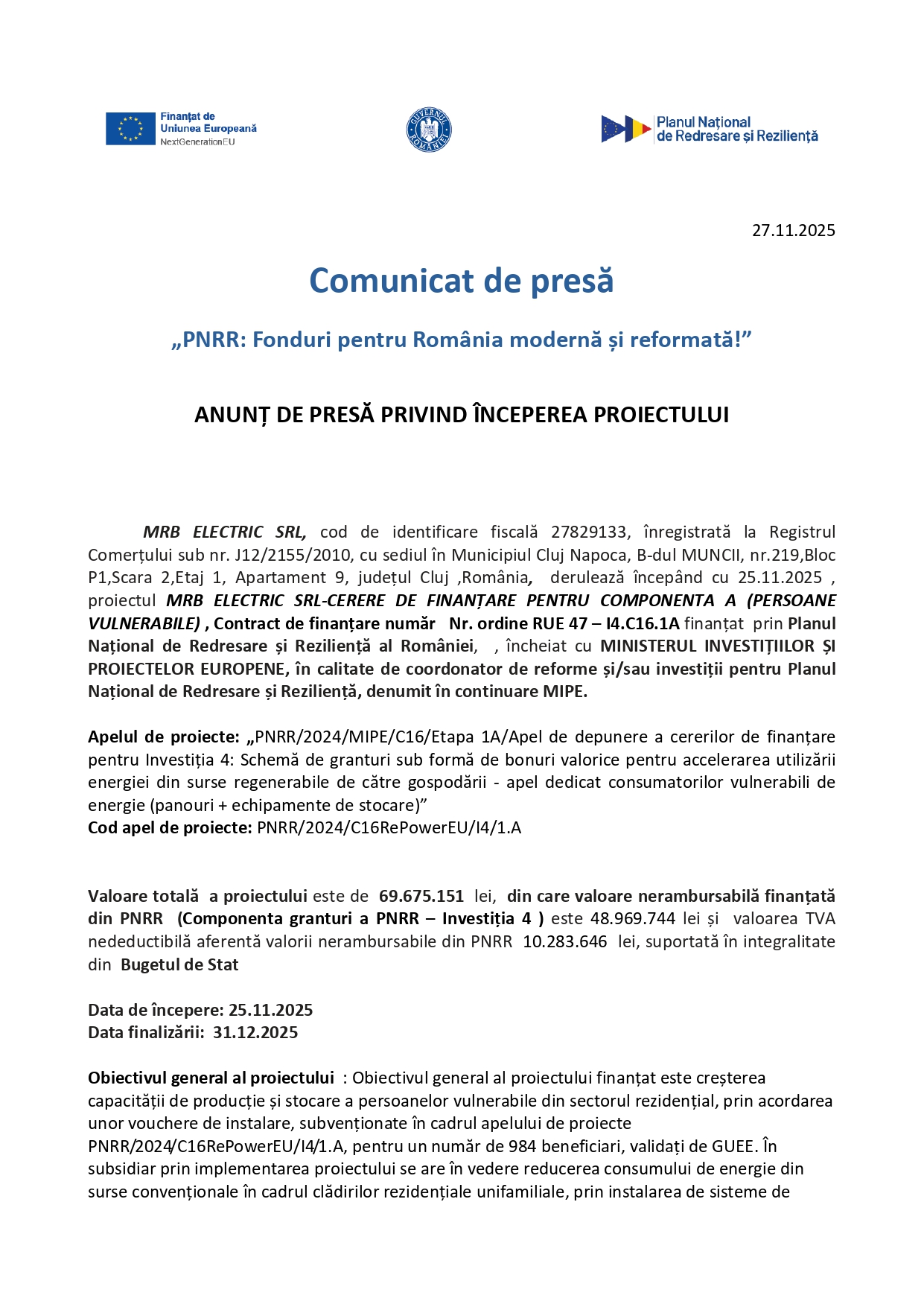 Anunțuri MRB ELECTRIC SRL – Anunț de presă privind începerea proiectului 11:13, Scris de: Advertorial