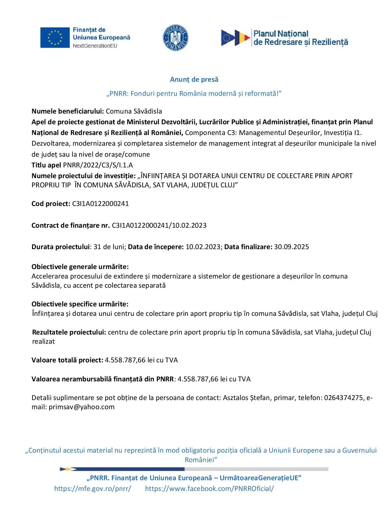 Anunțuri Comuna Săvădisla anunță finalizarea proiectului “Înființarea și dotarea unui centru de colectare” cod proiect C3I1A0122000241 11:12, Scris de: Advertorial Etichete: comunicat de presa finalizare proiect comuna savadisla judetul cluj
