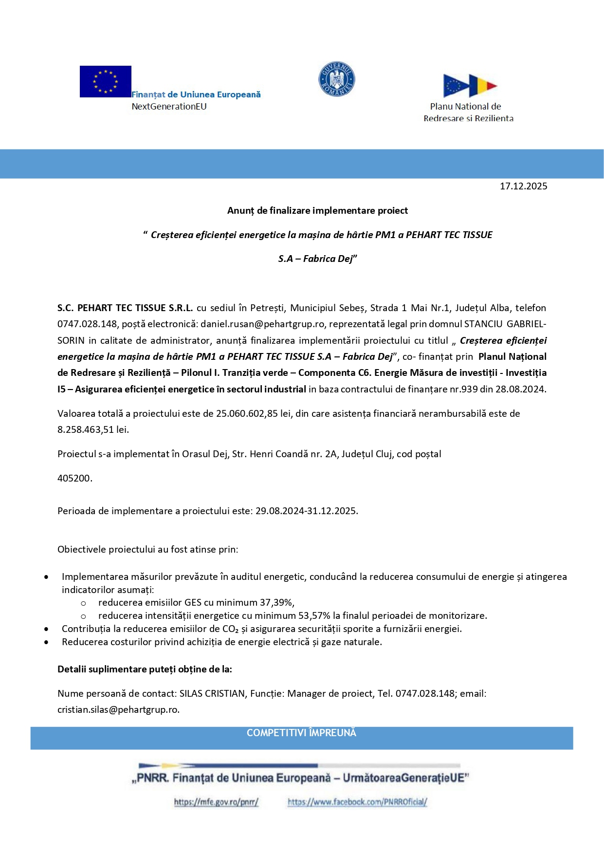 Anunțuri Anunț de finalizare implementare proiect “ Creșterea eficienței energetice la mașina de hârtie PM1 a PEHART TEC TISSUE S.A – Fabrica Dej” 15:22, Scris de: Advertorial