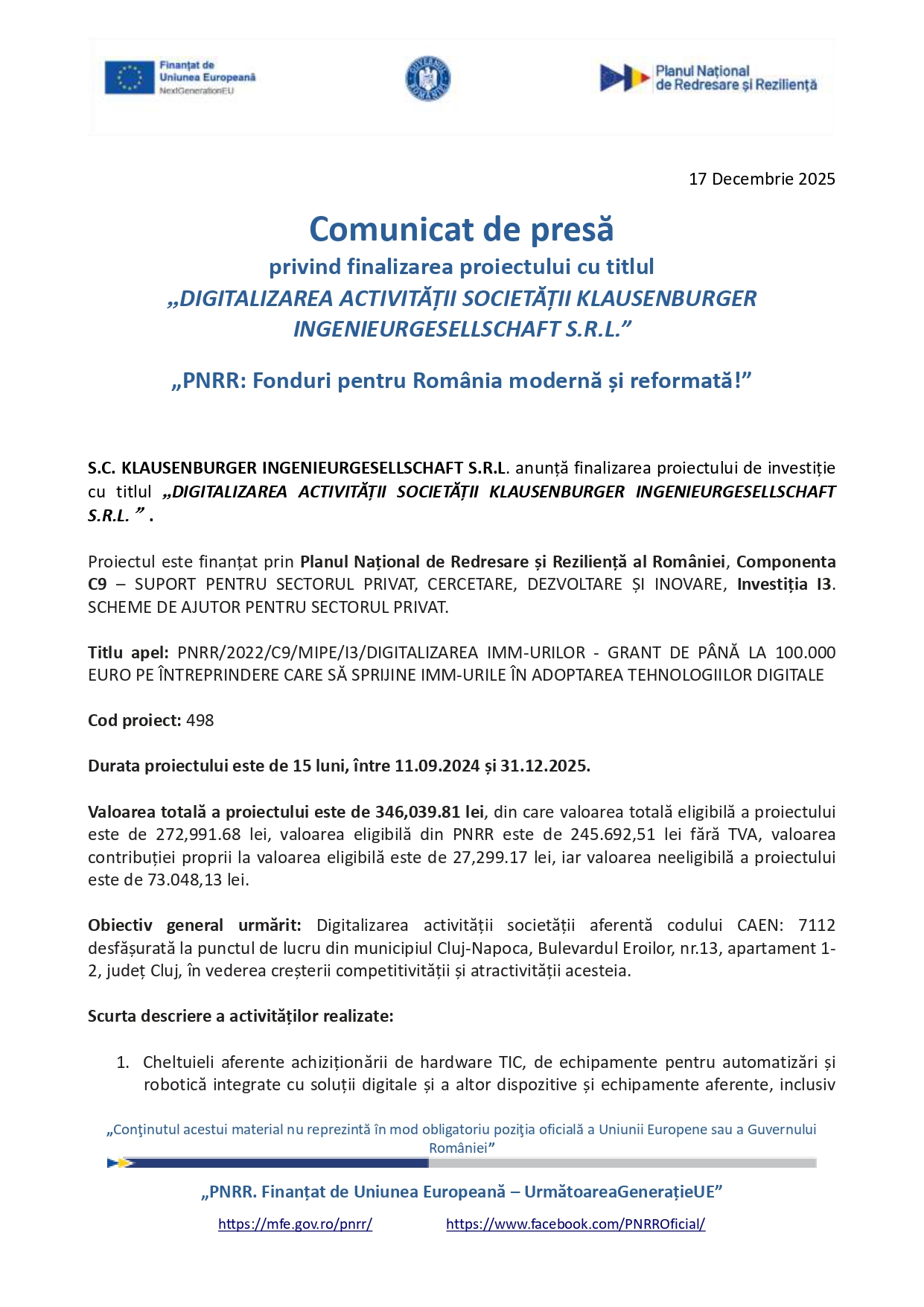 Anunțuri Comunicat de presă privind finalizarea proiectului cu titlul „DIGITALIZAREA ACTIVITĂȚII SOCIETĂȚII KLAUSENBURGER INGENIEURGESELLSCHAFT S.R.L.” 16:37, Scris de: Advertorial