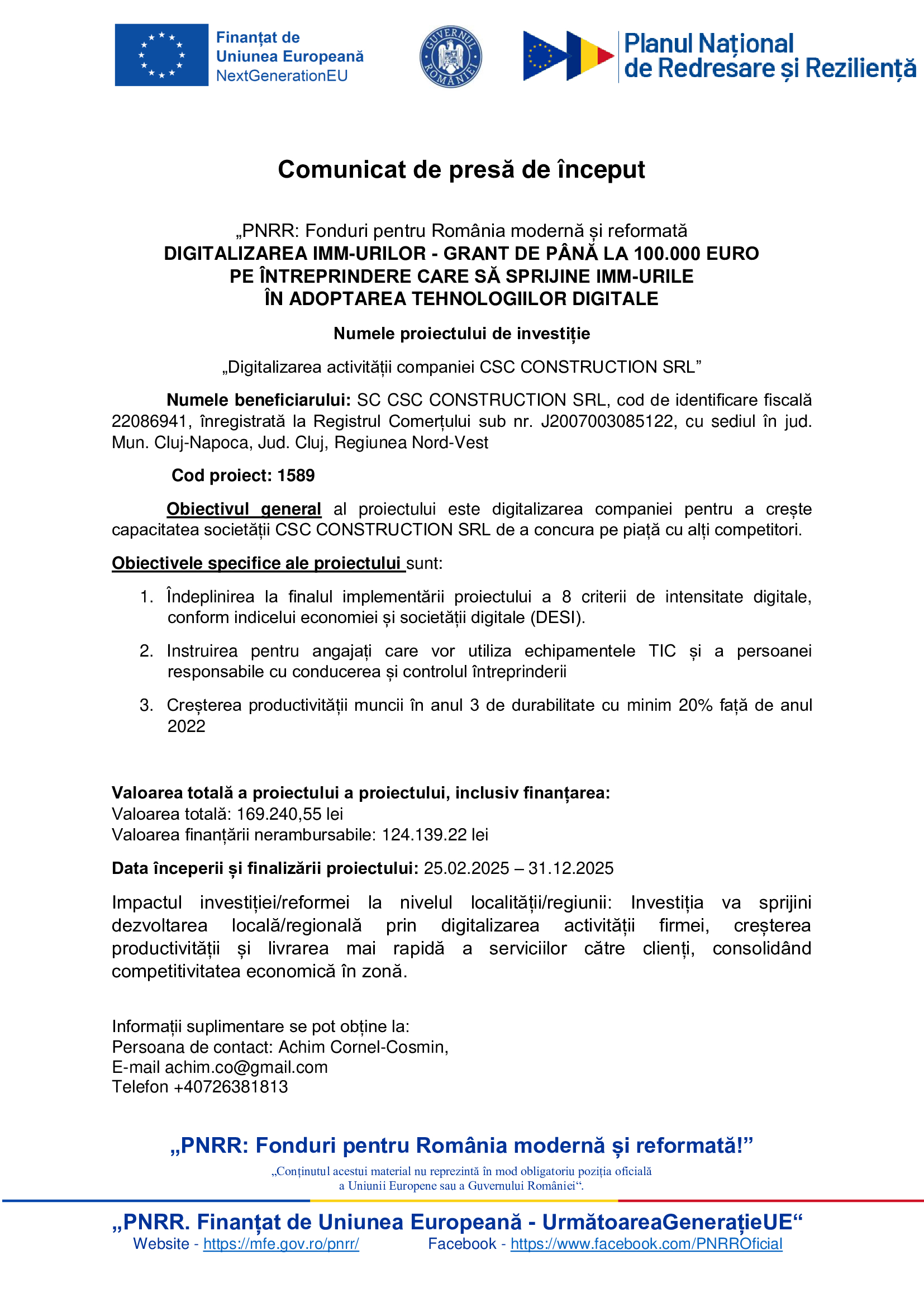 Anunțuri Comunicat de presă privind începerea proiectului „Digitalizarea activității companiei CSC CONSTRUCTION S.R.L.” Marți, 25 Februarie 2025, Scris de: mica publicitate