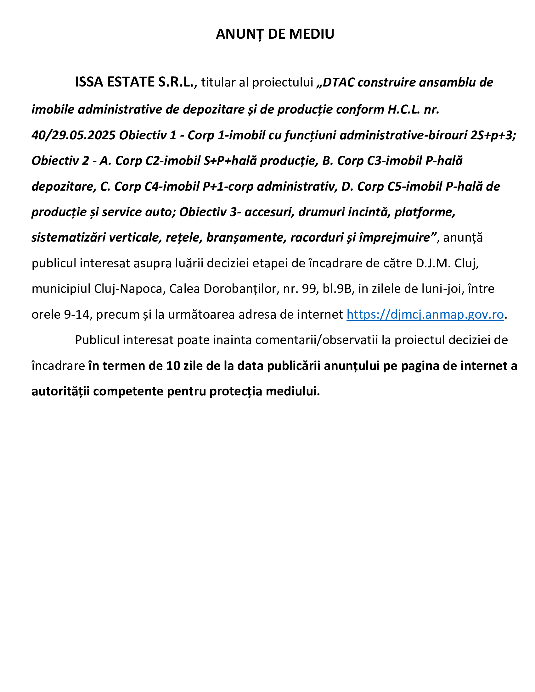 ISSA ESTATE S.R.L. - Anunț de mediu