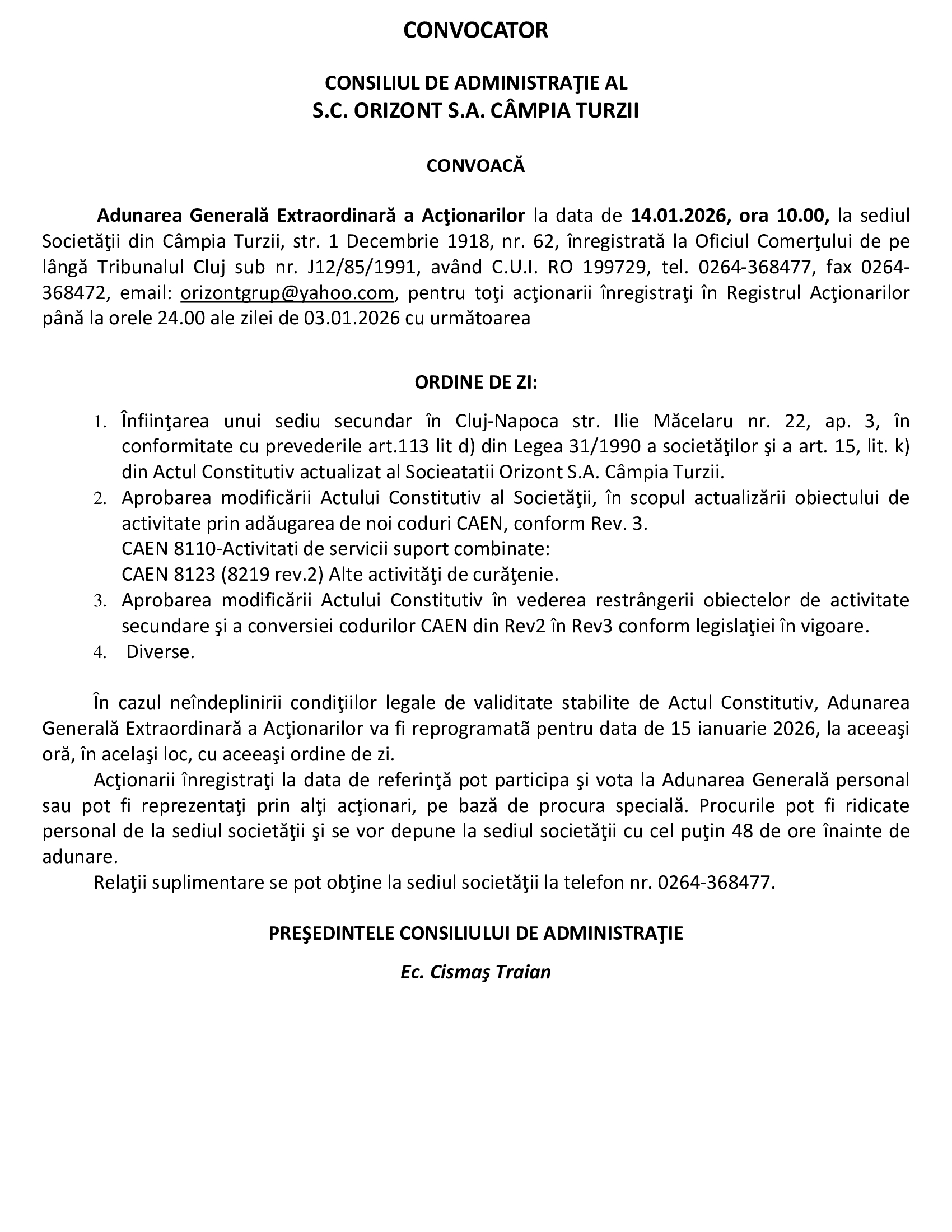 Anunțuri S.C. ORIZONT S.A. CÂMPIA TURZII - Anunț Convocator Vineri, 12 Decembrie 2025, Scris de: mica publicitate