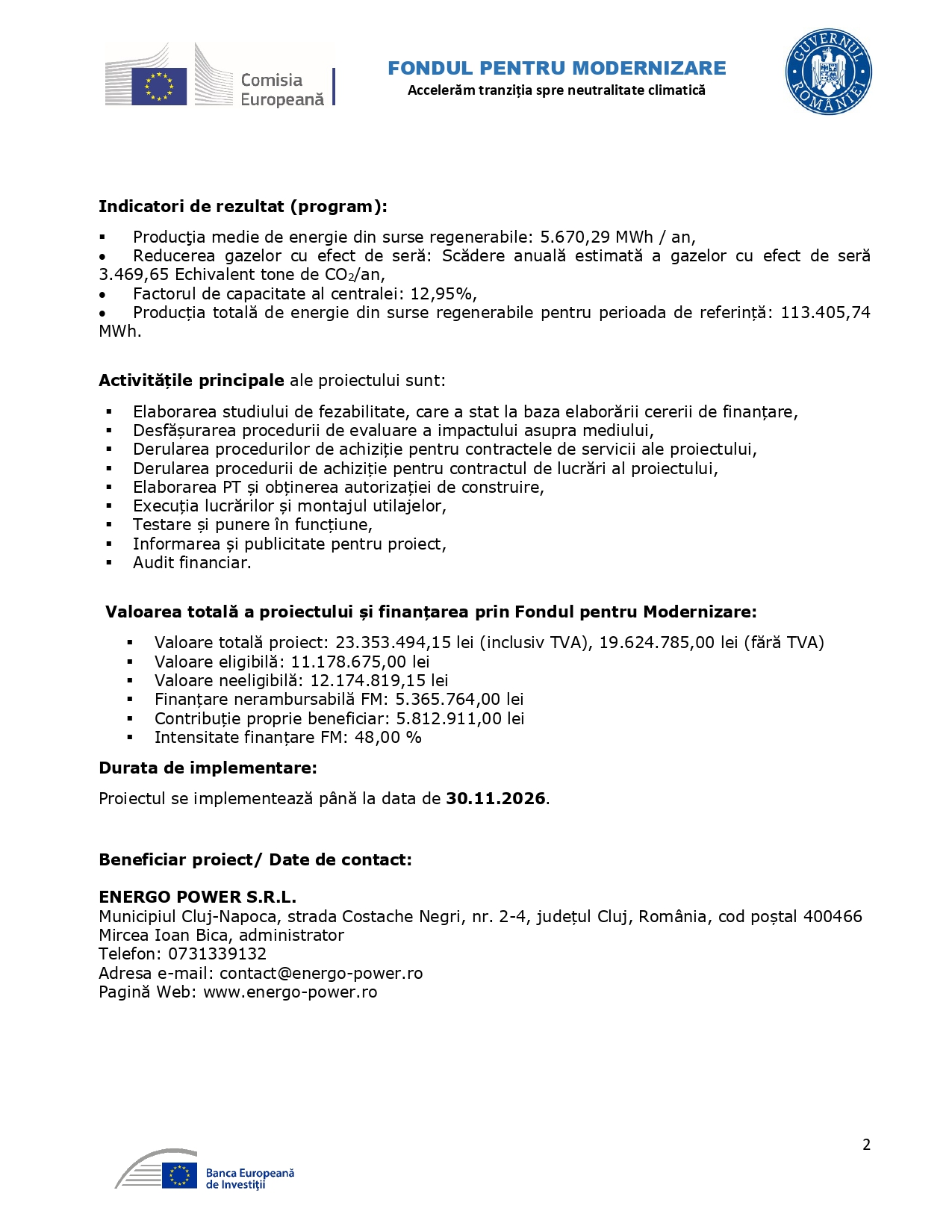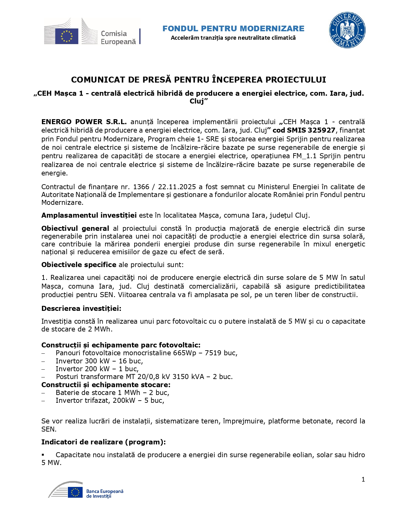 Anunțuri Anunț - ENERGO POWER S.R.L. anunță începerea implementării proiectului „CEH Mașca 1 - centrală electrică hibridă de producere a energiei electrice, com. Iara, jud. Cluj” cod SMIS 325927 08:30, Scris de: Advertorial