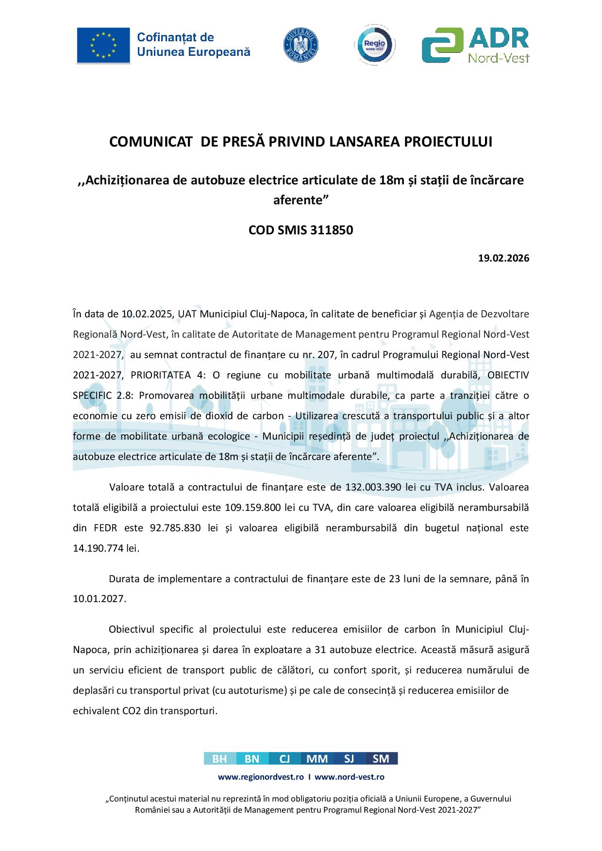 Anunțuri Comunicat de presă pentru lansare proiect ,,Achiziționarea de autobuze electrice articulate de 18m și stații de încărcare aferente” 11:01, Scris de: Advertorial Etichete: comunicat de presa demarare proiect autobuze electrice
