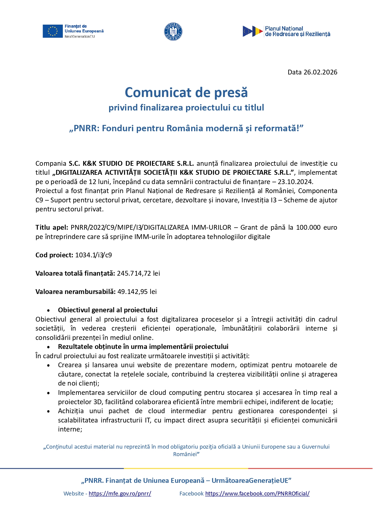 Anunțuri Comunicat de presă - Compania S.C. K&K STUDIO DE PROIECTARE S.R.L. anunță finalizarea proiectului de investiție cu titlul „DIGITALIZAREA ACTIVITĂȚII SOCIETĂȚII K&K STUDIO DE PROIECTARE S.R.L.” 08:23, Scris de: Advertorial