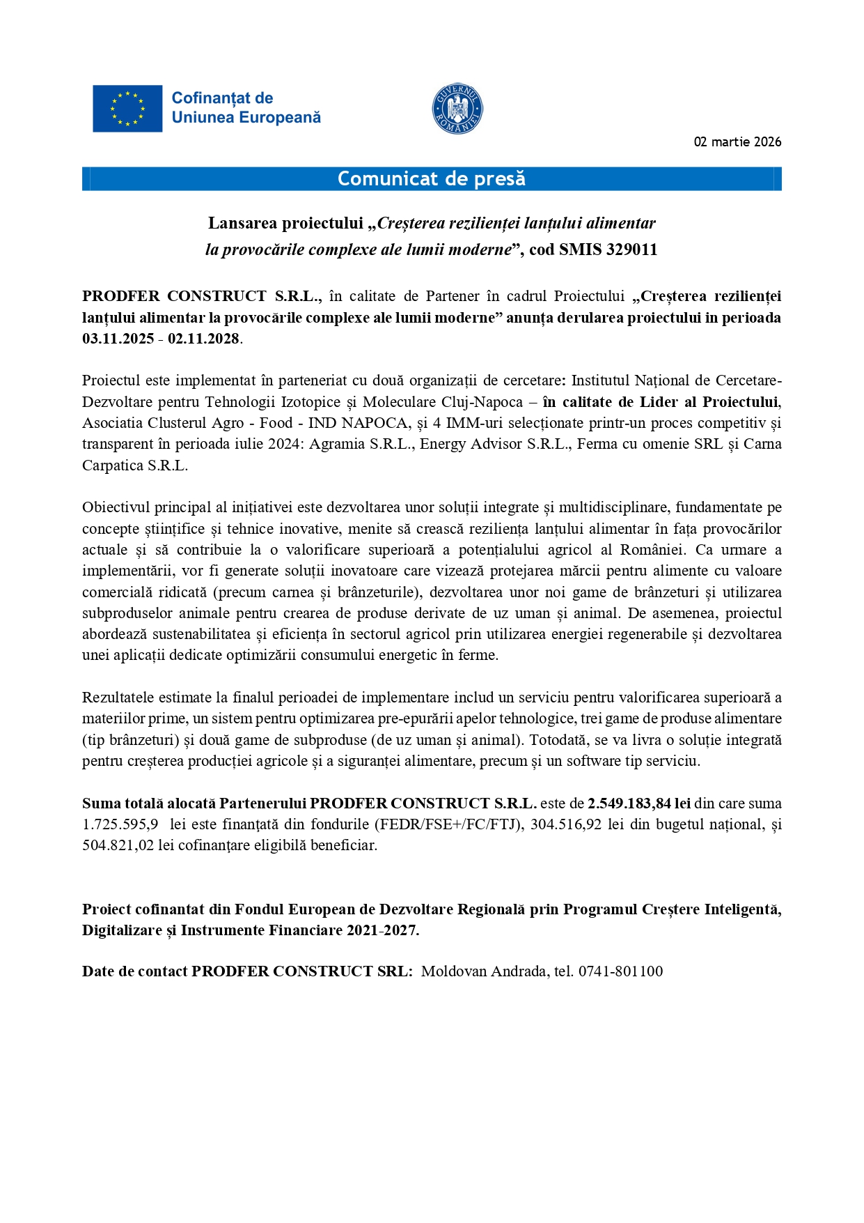 Anunțuri Comunicat de presă - Lansarea proiectului „Creșterea rezilienței lanțului alimentar la provocările complexe ale lumii moderne”, cod SMIS 329011 15:51, Scris de: Advertorial