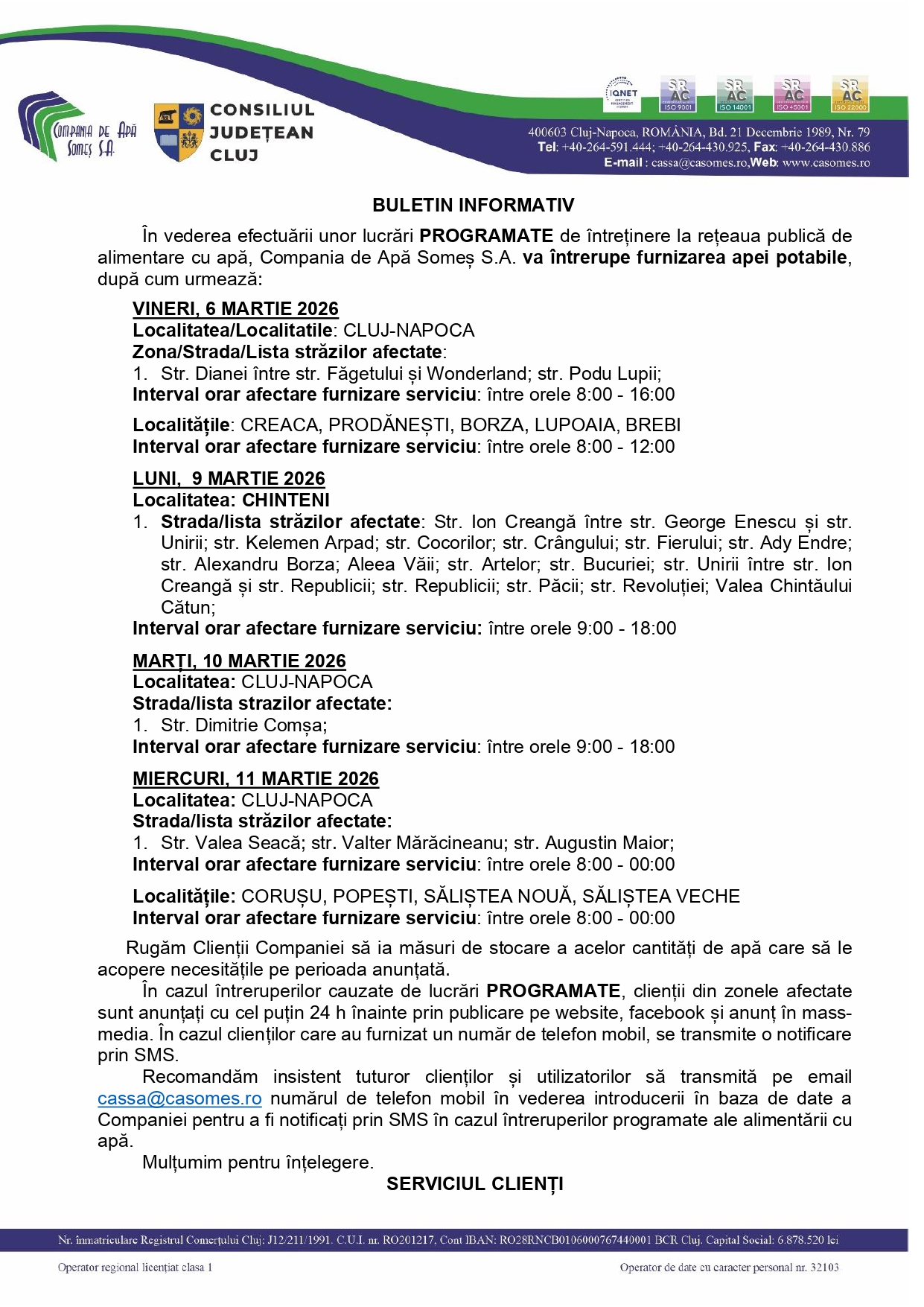 Anunțuri Anunț - În vederea efectuării unor lucrări PROGRAMATE de întreținere la rețeaua publică de alimentare cu apă, Compania de Apă Someș S.A. va întrerupe furnizarea apei potabile, 09:31, Scris de: Advertorial