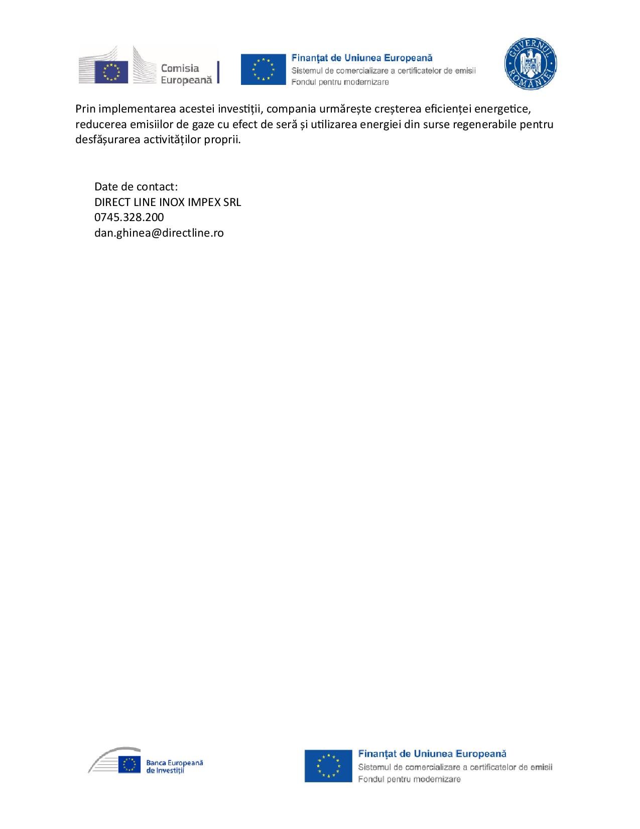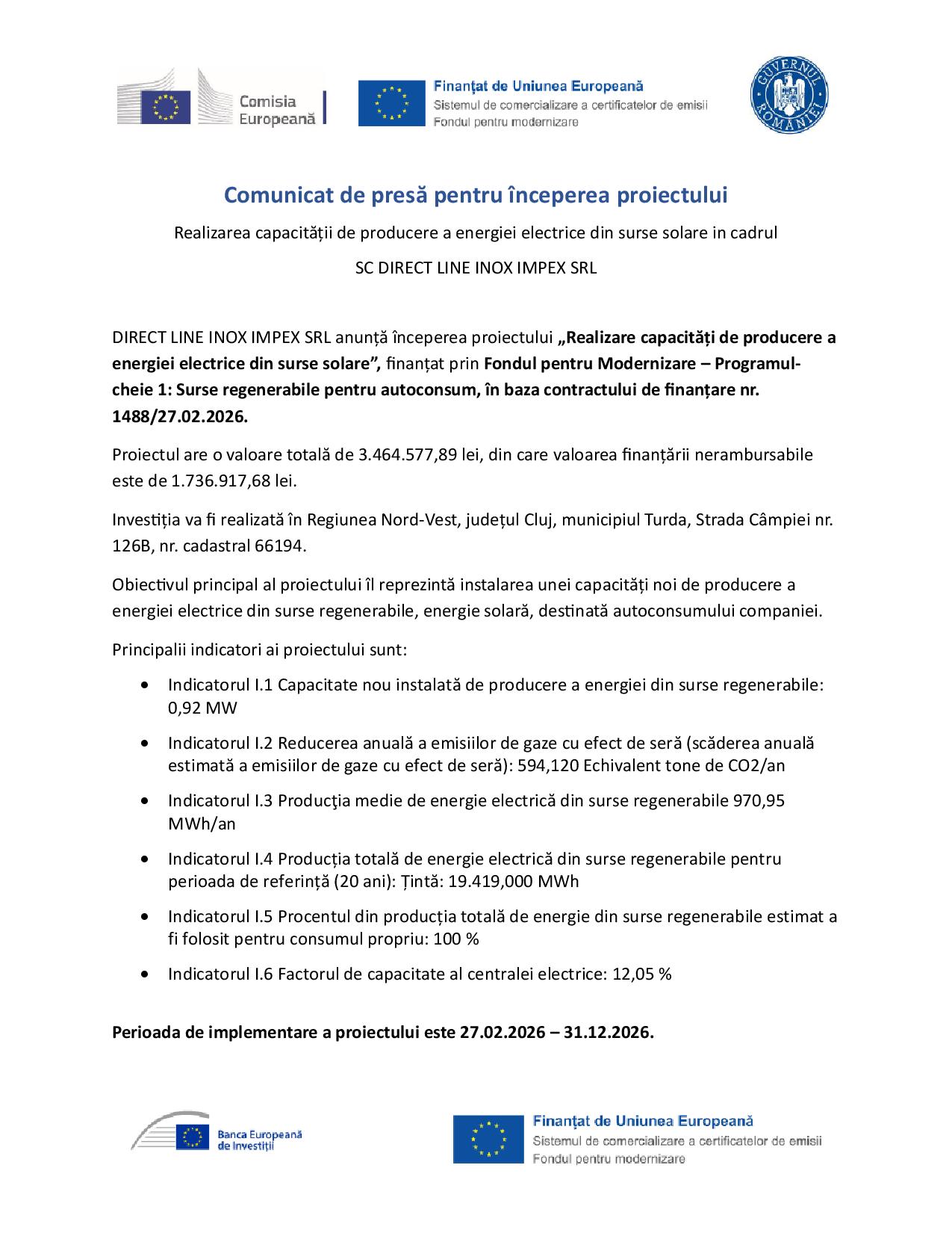 Anunțuri DIRECT LINE INOX IMPEX SRL anunță începerea proiectului „Realizare capacități de producere a energiei electrice din surse solare” 16:05, Scris de: Advertorial Etichete: comunicat de presa demarare proiect
