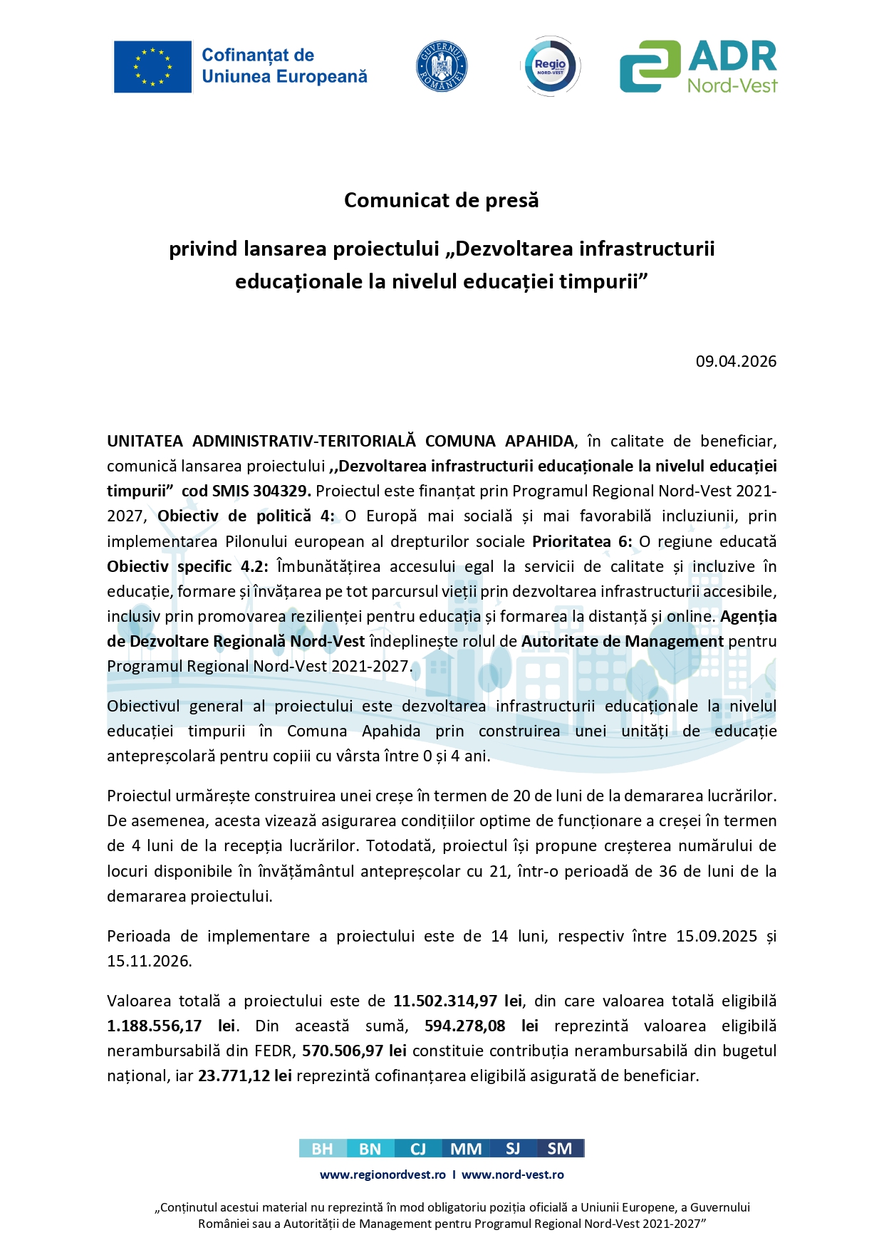 Anunțuri Comunicat de presă UAT Comuna Apahida privind lansarea proiectului „Dezvoltarea infrastructurii educaționale la nivelul educației timpurii” 10:05, Scris de: Advertorial