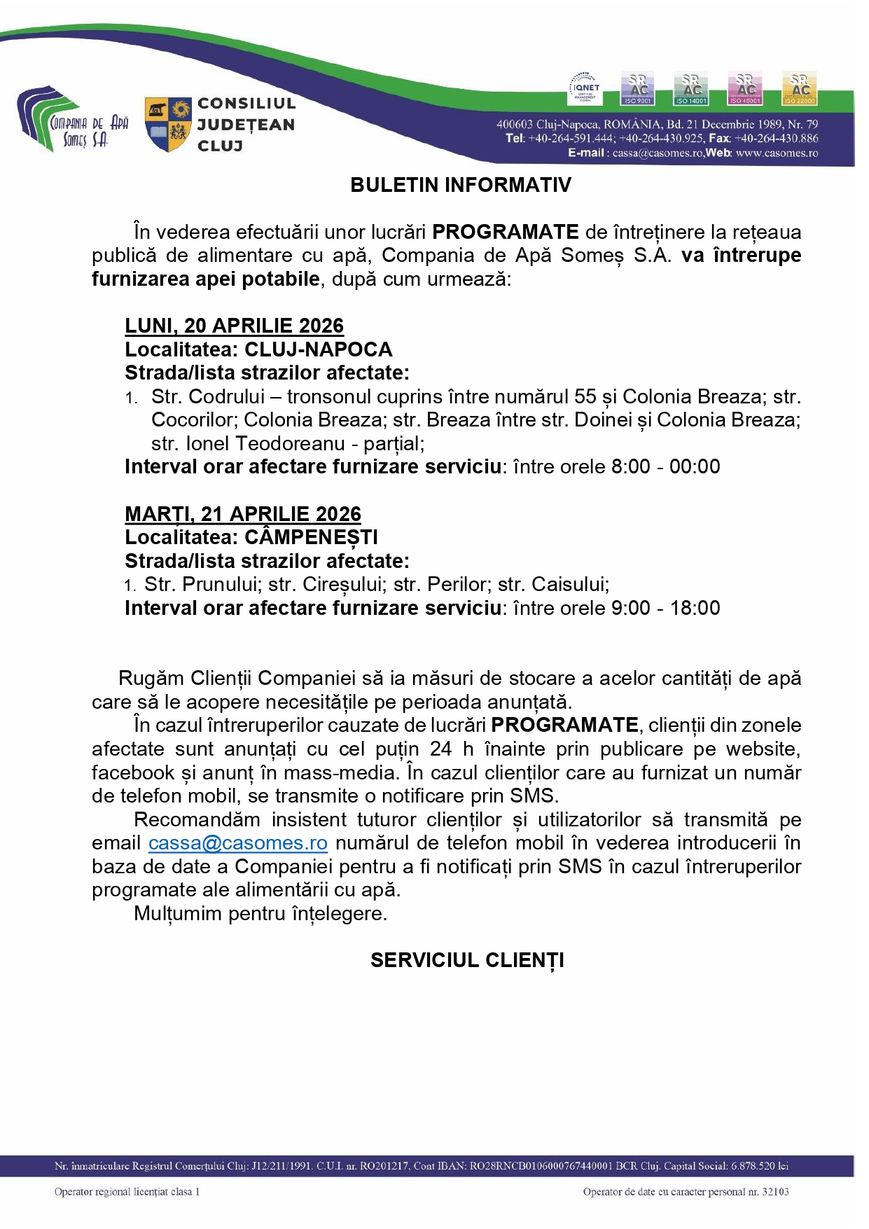 Anunțuri Compania de Apă Someș S.A. - Anunț privind întreruperea furnizării apei potabile 14:59, Scris de: Advertorial