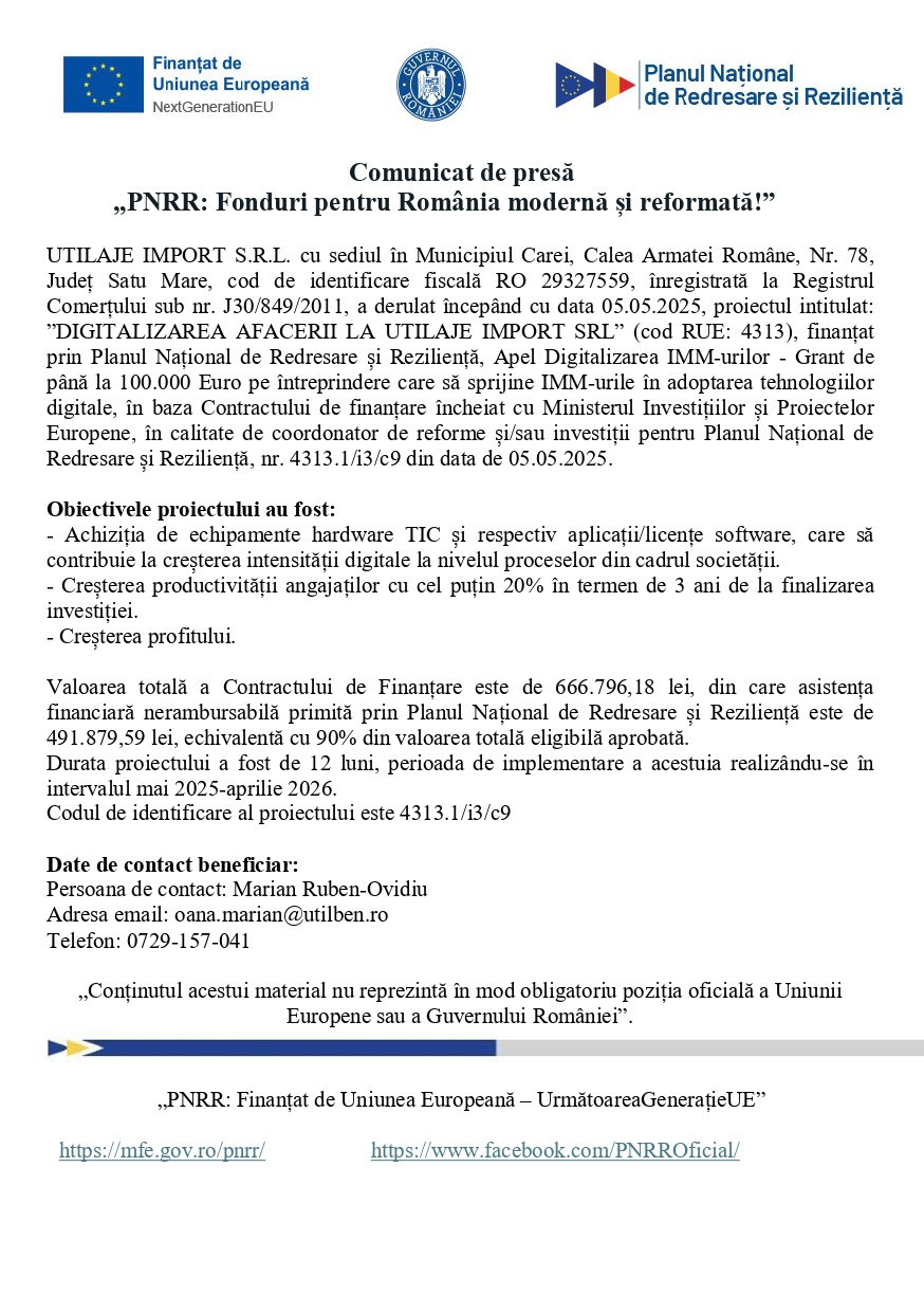 Anunțuri Comunicat de presă SC Utilaje Import S.R.L. - ”Digitalizarea afacerii la UTILAJE IMPORT SRL” 14:39, Scris de: Advertorial