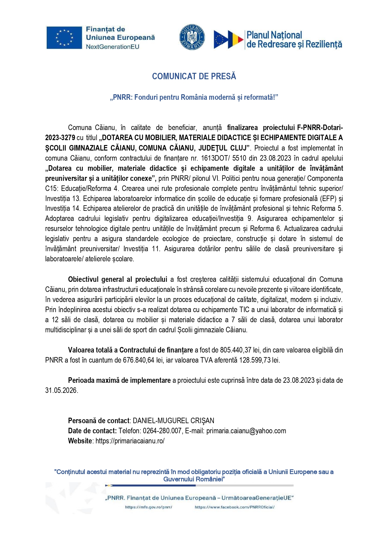 Comunicat de presă finalizare proiect - Comuna Căianu
