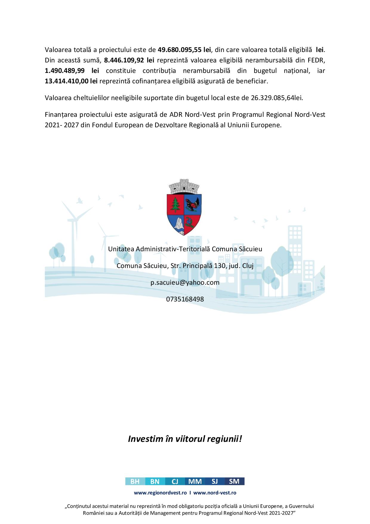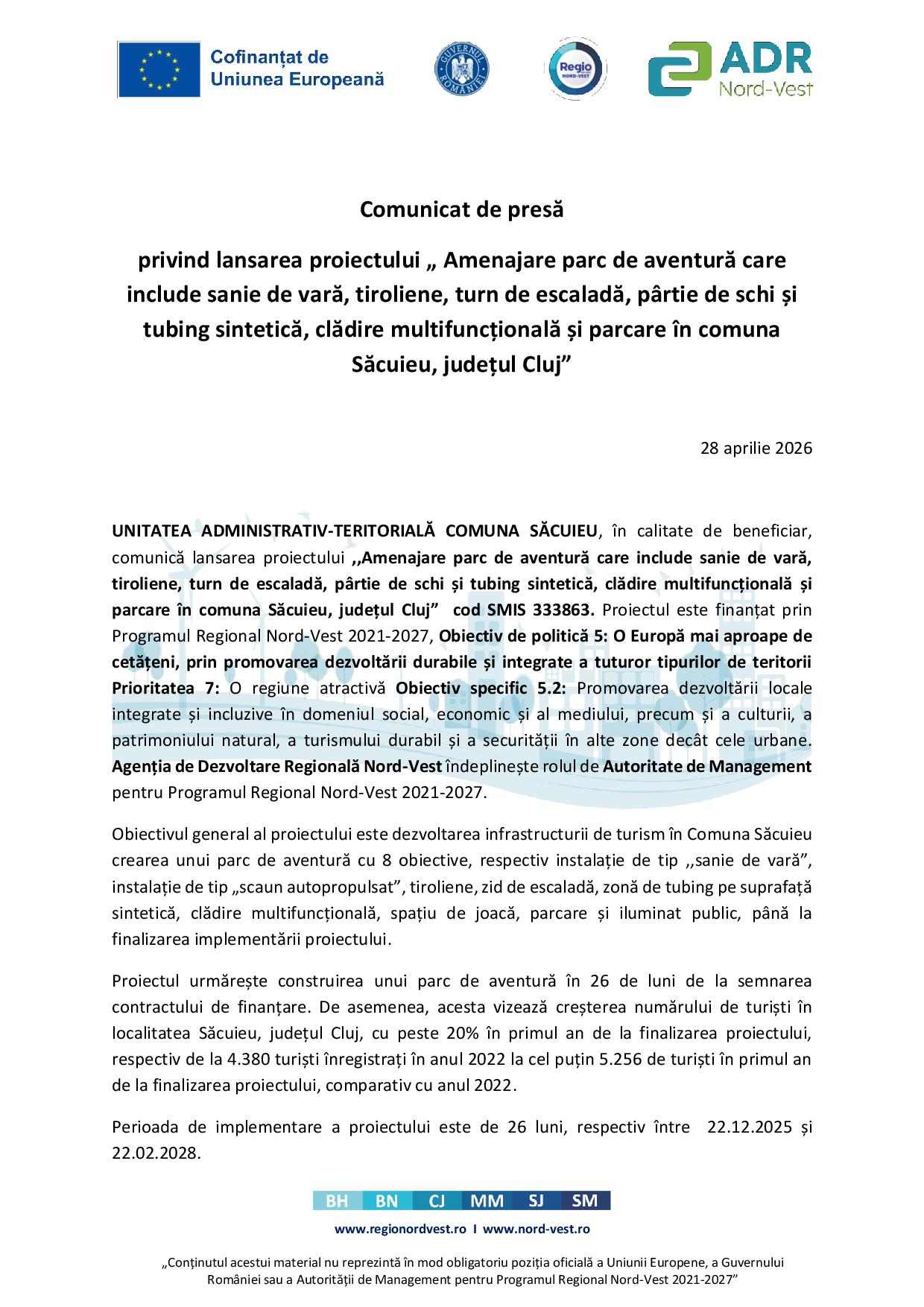 Anunțuri Comuna Săcuieu lansează proiectul,,Amenajare parc de aventură care include sanie de vară, tiroliene, turn de escaladă, pârtie de schi și tubing sintetică, clădire multifuncțională și parcare în comuna Săcuieu, județul Cluj” 11:21, Scris de: Advertorial Etichete: comuna sacuieu comunicat de presa demarare proiect judetul cluj parc de aventura adr nord vest