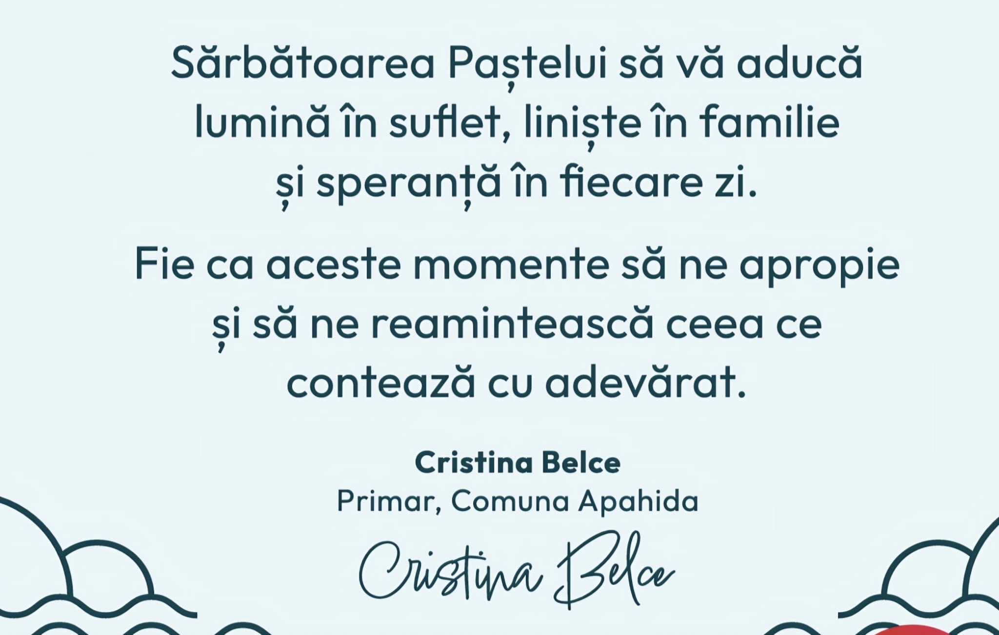 „Sărbătoarea Paștelui să vă aducă lumină în suflet, liniște în familie și speranță în fiecare zi. Fie ca aceste momente să ne apropie și să ne reamintească ceea ce contează cu adevărat”, a transmis Cristina Belce. Mesajul a fost publicat de administrația locală în contextul apropierii Paștelui, ca urare adresată întregii comunități din Apahida.