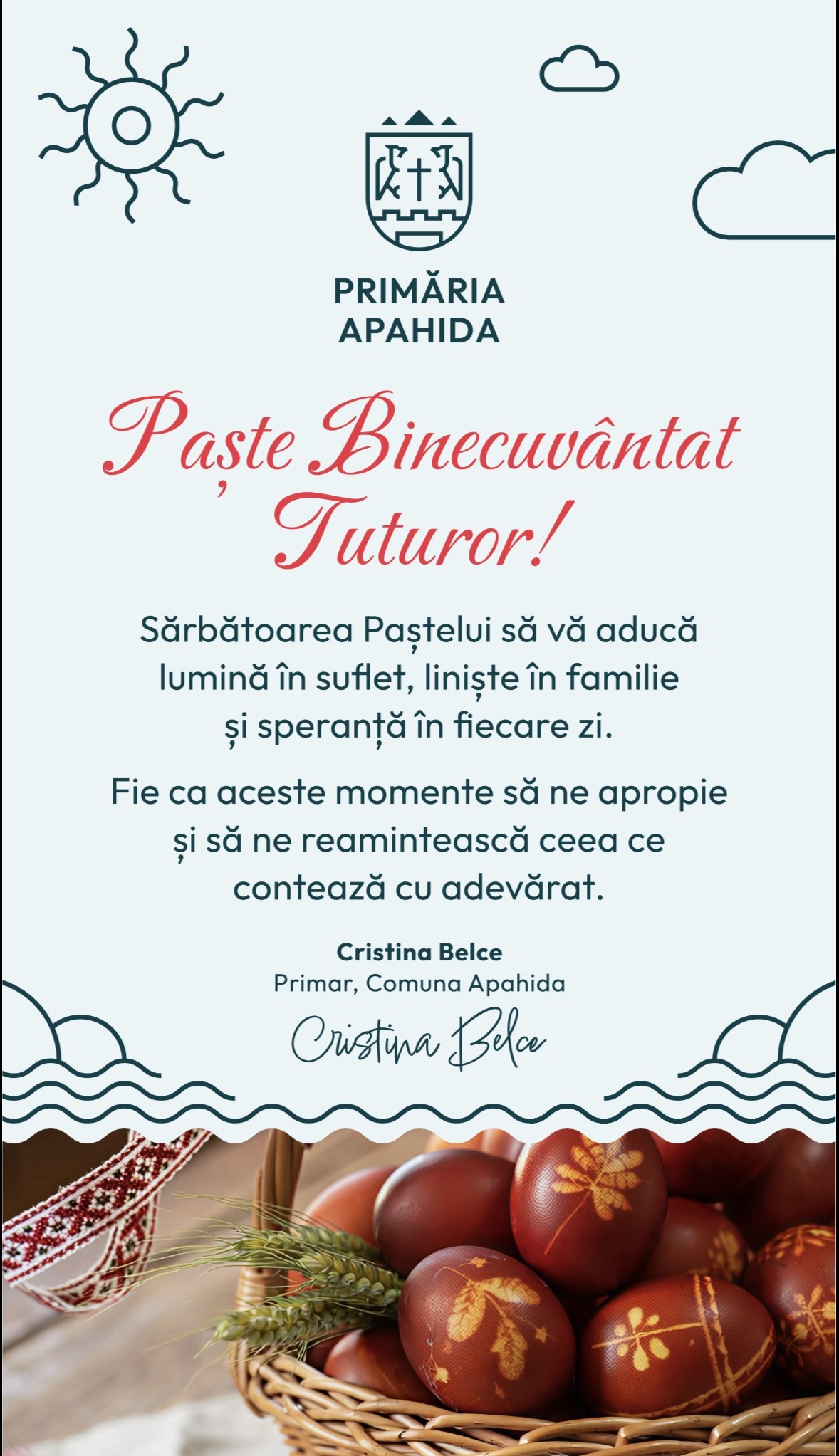 Primăria comunei Apahida a transmis un mesaj cu prilejul sărbătorilor pascale către locuitorii comunei, prin intermediul primarului Cristina Belce. În mesajul adresat comunității, edilul le-a urat localnicilor să aibă parte de sărbători binecuvântate și a evidențiat semnificația spirituală și familială a Paștelui.