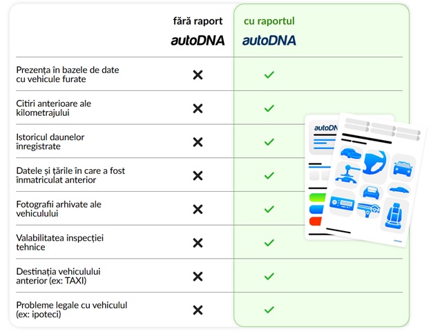 O practică sănătoasă este compararea înregistrărilor din cartea de service cu un raport despre istoria vehiculului generat pe baza numărului VIN (de exemplu, de pe autoDNA.ro).. Un astfel de raport oferă, de regulă: