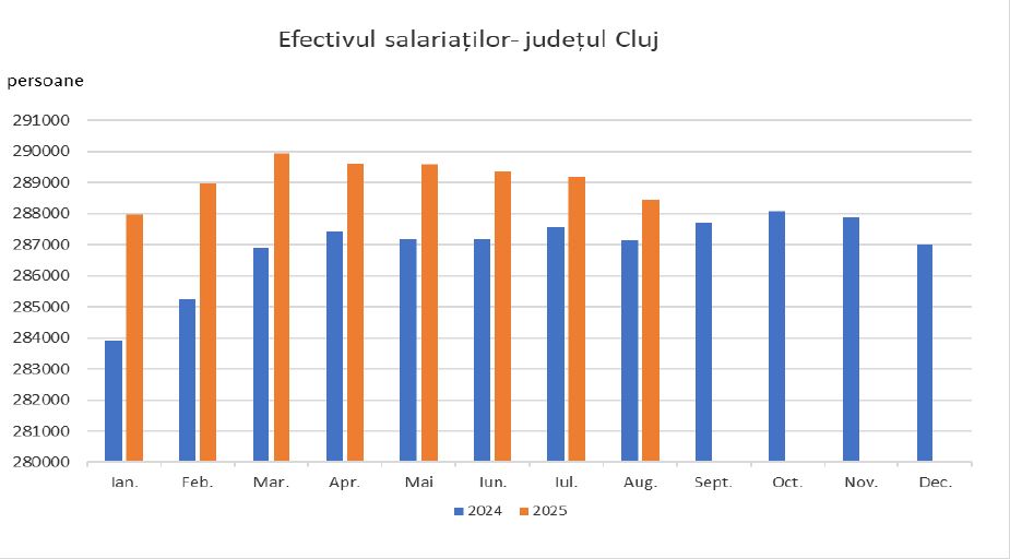 Efectivul salariaților din județul Cluj, la sfârșitul lunii august 2025 a fost de 288.444 persoane, în scădere cu 721 persoane comparativ cu luna iulie 2025 și cu 1.304 persoane mai multe față de luna august 2024, conform sursei citate.