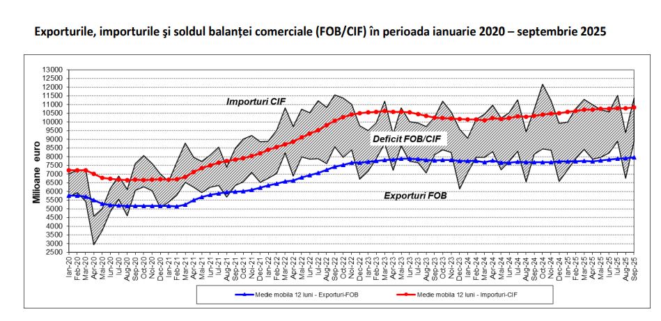 În luna septembrie 2025, exporturile României au însumat 8,89 miliarde de euro, iar importurile s-au ridicat la 11,38 miliarde de euro, ceea ce a generat un deficit comercial de 2,48 miliarde de euro. Comparativ cu luna septembrie 2024, exporturile au crescut cu 9,2%, iar importurile cu 6,2%, potrivit INS.