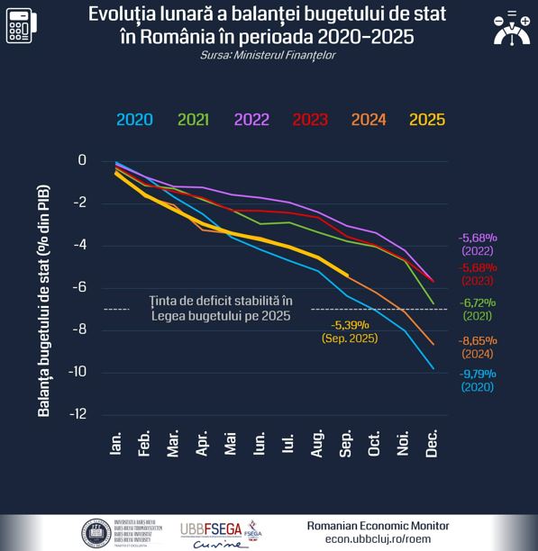 „Procesul de consolidare bugetară avansează lent, deficitul bugetar rămânând aproape de traiectoria anului trecut. Astfel, ultimele luni ale anului 2025 vor fi decisive”, se arată în mesajul publicat pe pagina de Facebook de cercetătorii de la Facultatea de Științe Economice și Gestiunea Afacerilor (FSEGA) a Universității Babeș-Bolyai.