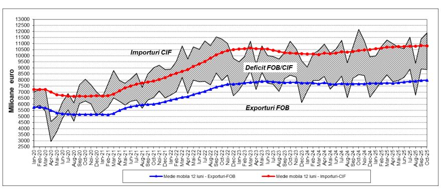 Exporturile FOB au însumat 81,054 miliarde de euro, în creștere cu 4,3% comparativ cu perioada ianuarie - octombrie 2024, iar importurile CIF au crescut la 108,547 miliarde de euro, un plus de 3,4% față de același interval.