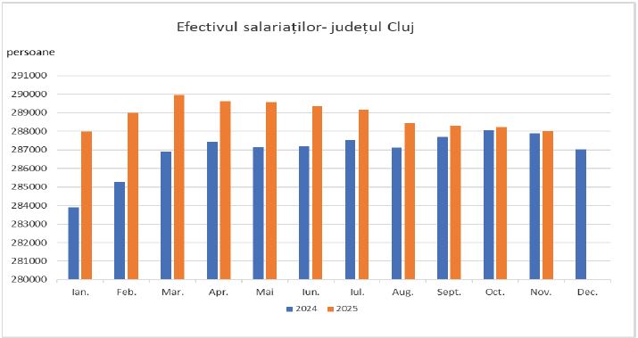 Totdată, numărul salariaților din județul Cluj, la sfârșitul lunii noiembrie 2025 a fost de 287.993 persoane, în scădere cu 221 persoane comparativ cu luna octombrie 2025 și cu 100 persoane mai multe față de luna noiembrie 2024.