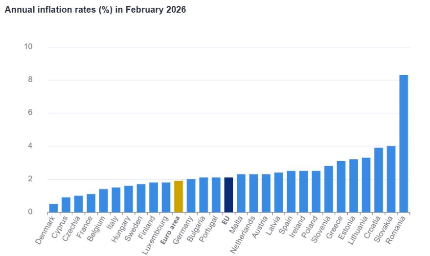 Deși rata anuală a inflației în Uniunea Europeană a crescut ușor la 2,1% în februarie, de la un nivel de 2% luna precedentă, România este în continuare țara cu cea mai ridicată inflație, cu un avans anual al prețurilor de 8,3%.