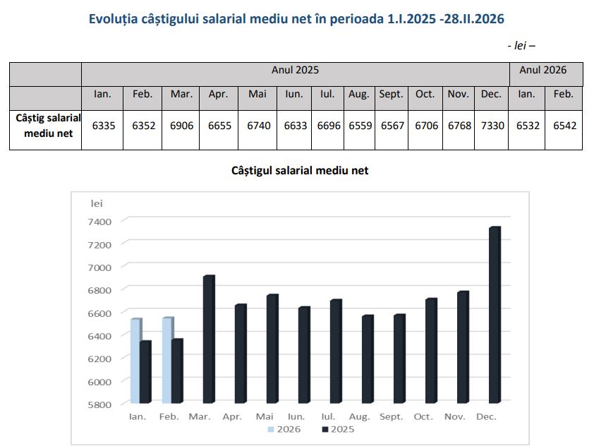 În februarie 2026, salariul mediu net a crescut nesemnificativ – o majorare simbolică de numai 10 lei, față de luna anterioară.