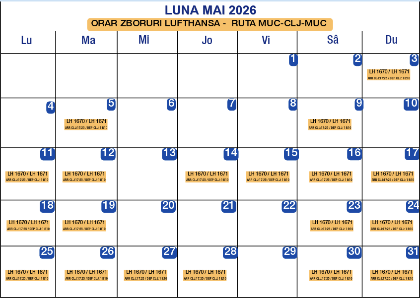 Între timp, Lufthansa a transmis și o actualizare a programului de zbor pentru cursele Cluj - München, iar programul în luna mai 2026 diferă puțin.