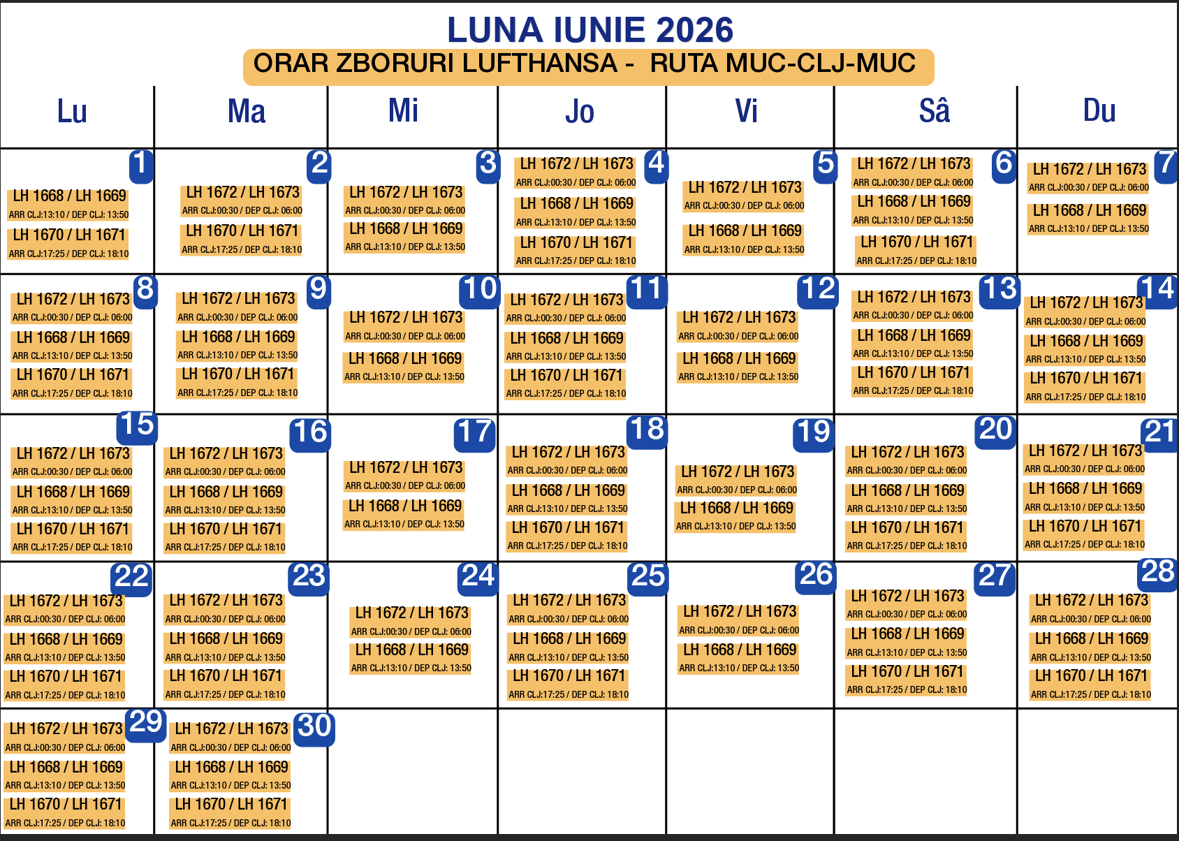 Programul actualizat al zborurilor Lufthansa, de la și către Cluj a fost publicat joi, 30 aprilie 2026, pe site-ul Aeroportului Cluj.
