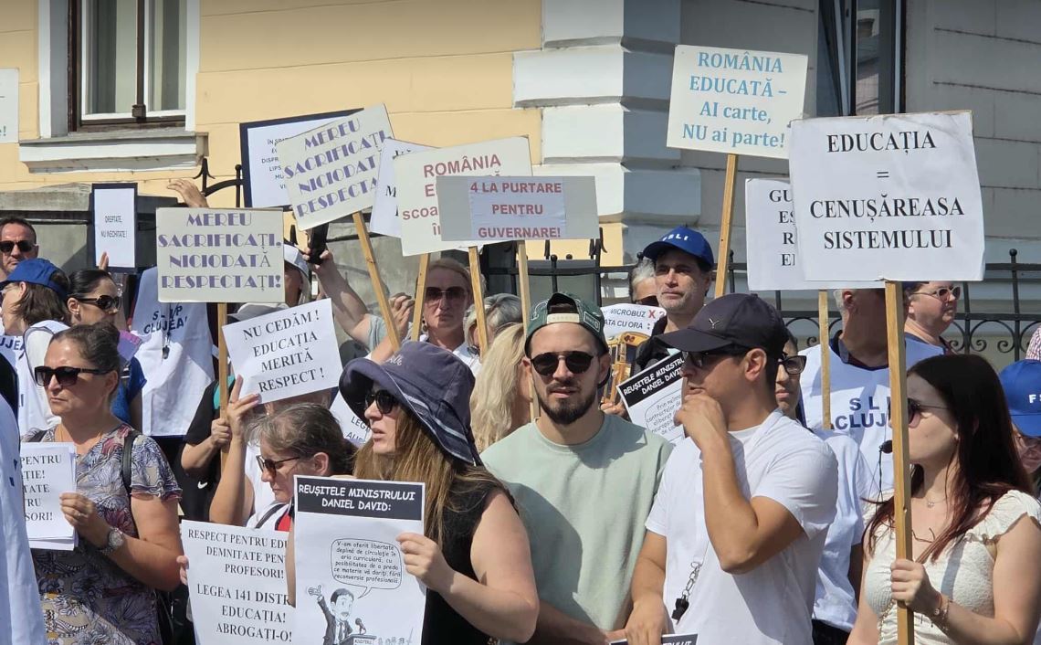 Câteva sute de sindicaliști din Educație au protestat, joi, în fața sediului Inspectoratului Școlar Județean Cluj față de măsurile de austeritate impuse de Guvern. Studenții s-au alăturat manifestației, solicitând respect pentru Educație.