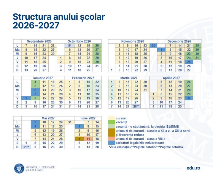 Ordinul care aprobă structura anului școlar 2026 - 2027 va fi disponibil pe site-ul Ministerului Educației și Cercetării după publicarea în Monitorul Oficial.â
