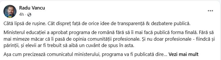 Așa cum precizează comunicatul ministerului, programa va fi publicată direct în Monitorul Oficial. Abia acolo îi vom vedea forma finală. Când e inutil să mai formulezi orice opinie asupra ei. Cât dispreț, cum spuneam. Și la adresa celor 3.500 de semnatari ai petiției care cerea refacerea programei. Și la adresa ideii că transparența & dezbaterea publică ar mai avea vreun sens în România. Și la adresa profesorilor, obligați pur și simplu să ia act de o programă publicată în Monitorul Oficial, fără să mai aibă posibilitatea de a își exprima vreo opinie asupra ei. Și la adresa elevilor & părinților, privați și ei de aceeași posibilitate”, notează scriitorul Radu Vancu într-un mesaj publicat pe pagina sa de Facebook.