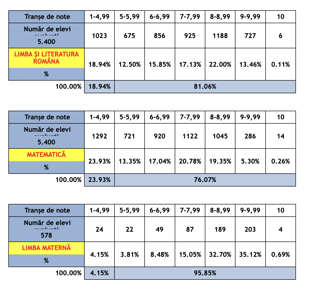 Pe tranșe de note și pe discipline, rezultatele elevilor clujeni se prezintă astfel: